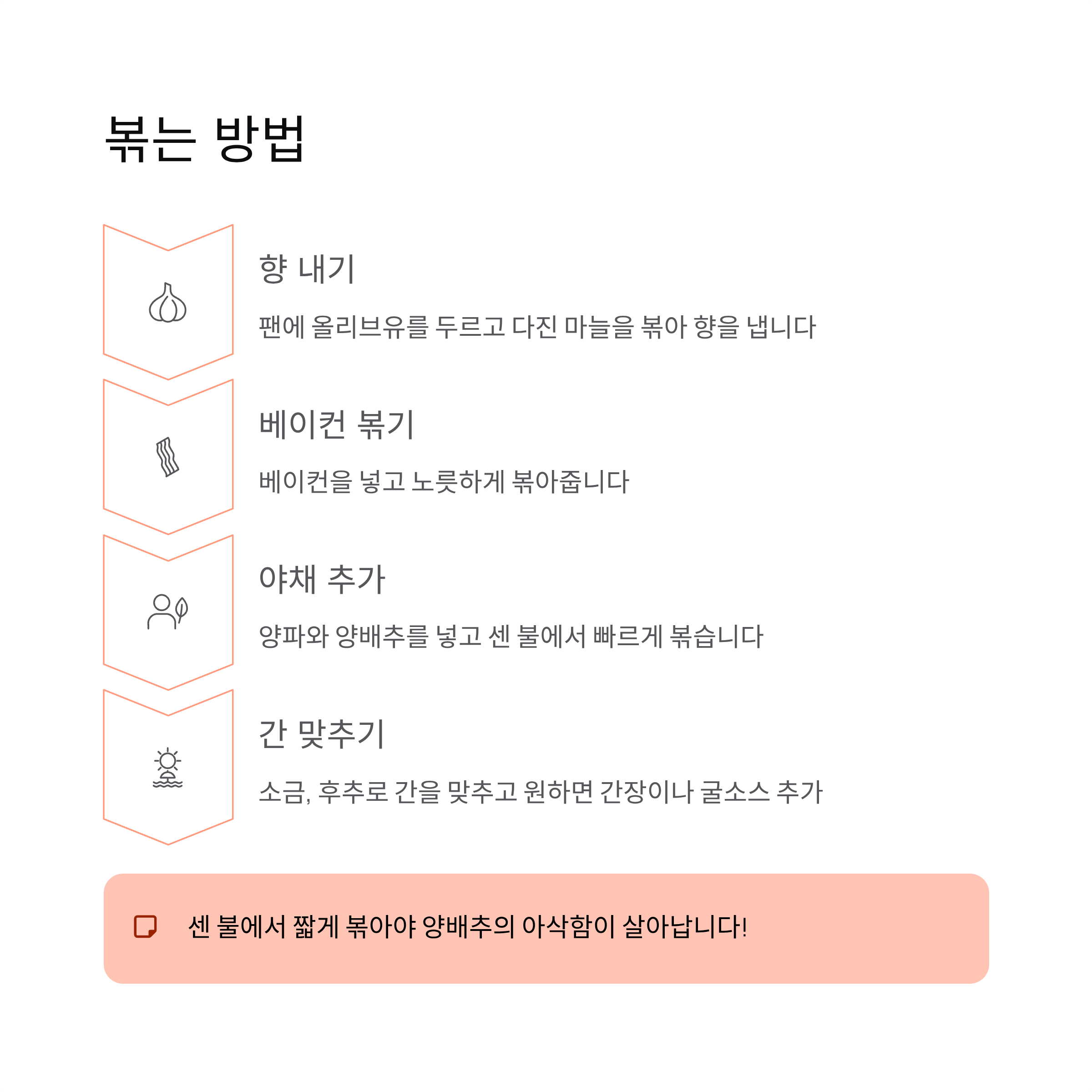 | 볶기2 | 양배추, 양파 넣기 | 센 불에서 빠르게 |