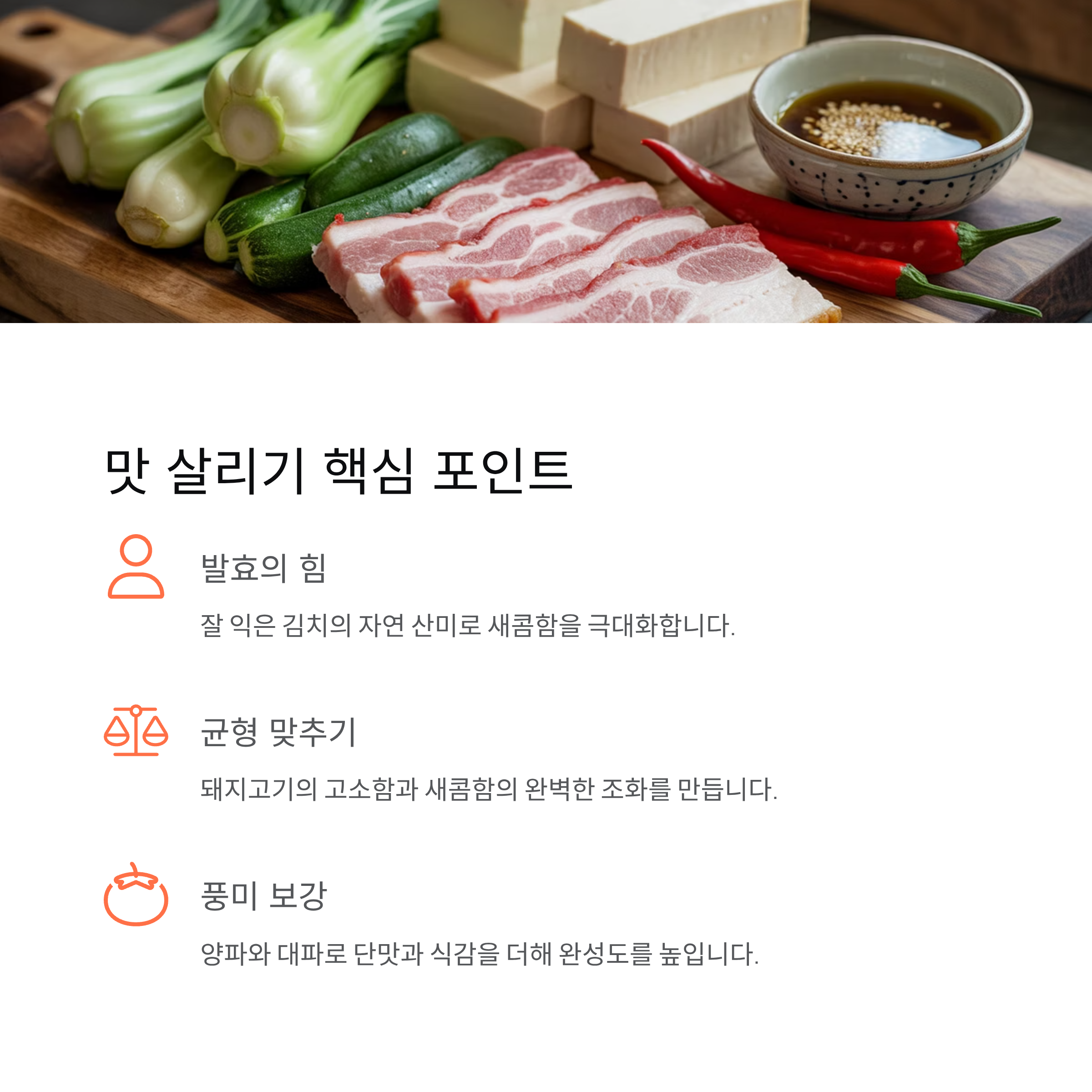 | 잘 익은 김치 | 발효로 생긴 자연스러운 산미 | 새콤함 극대화 |
