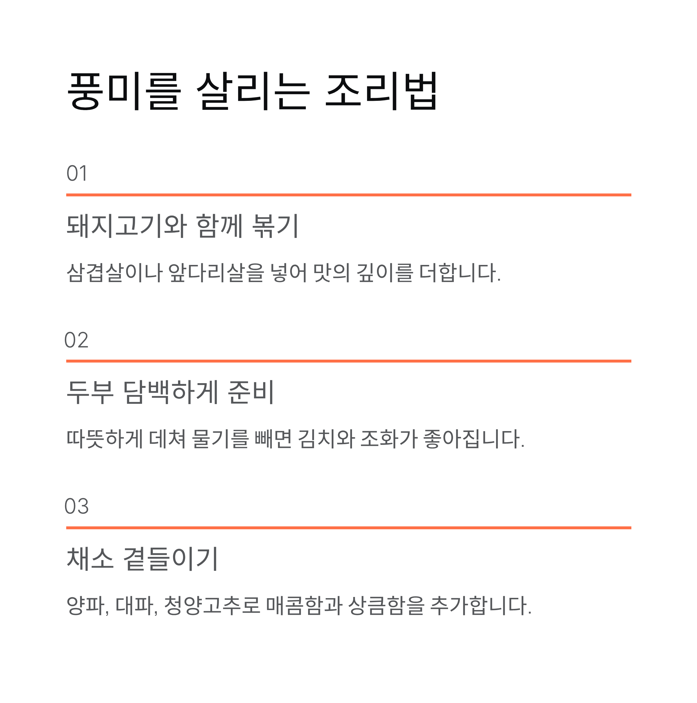간단한 팁만 기억해도 누구나 특별한 두부김치를 만들 수 있습니다.