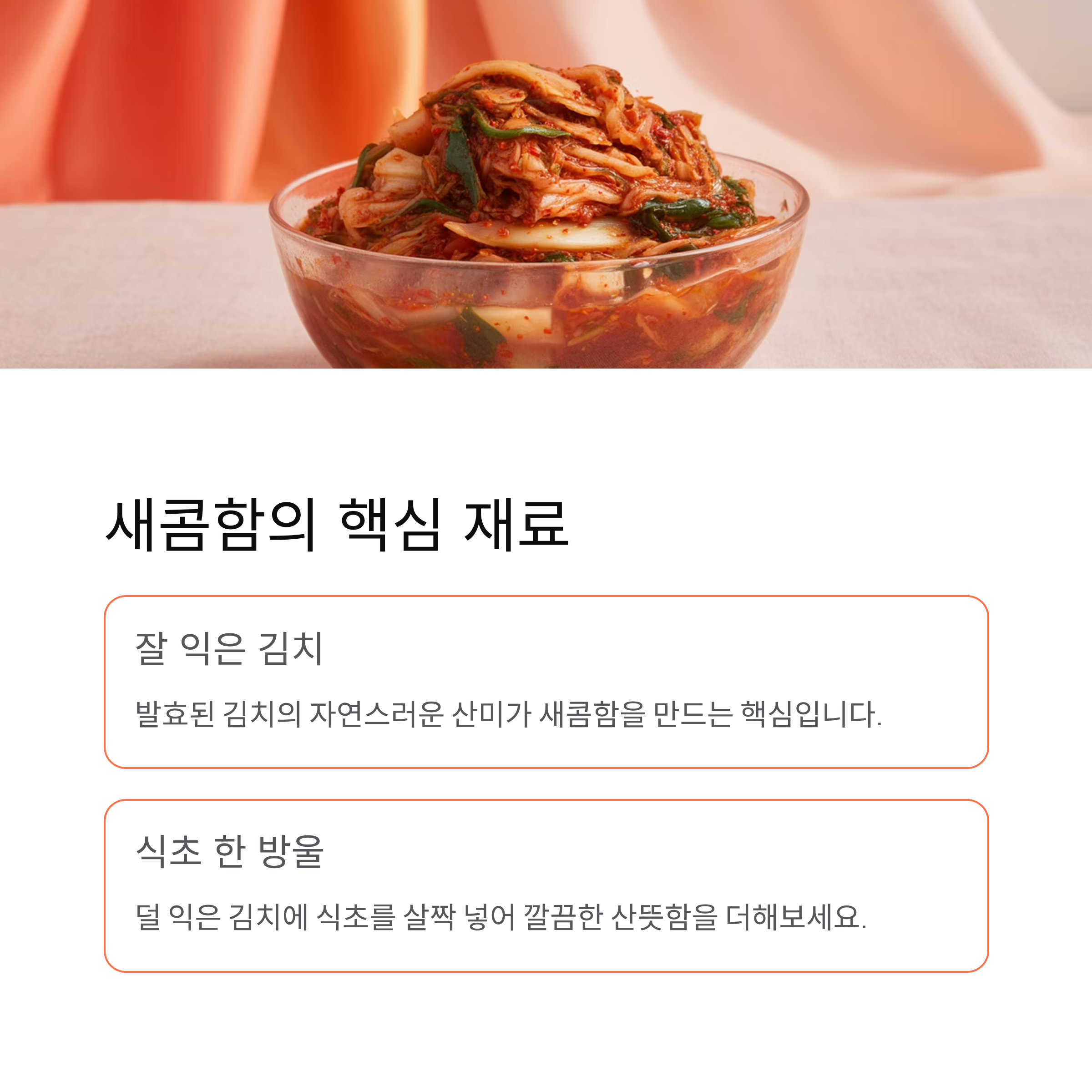 | 식초 한 방울 | 덜 익은 김치 보완 | 깔끔한 산뜻함 |
