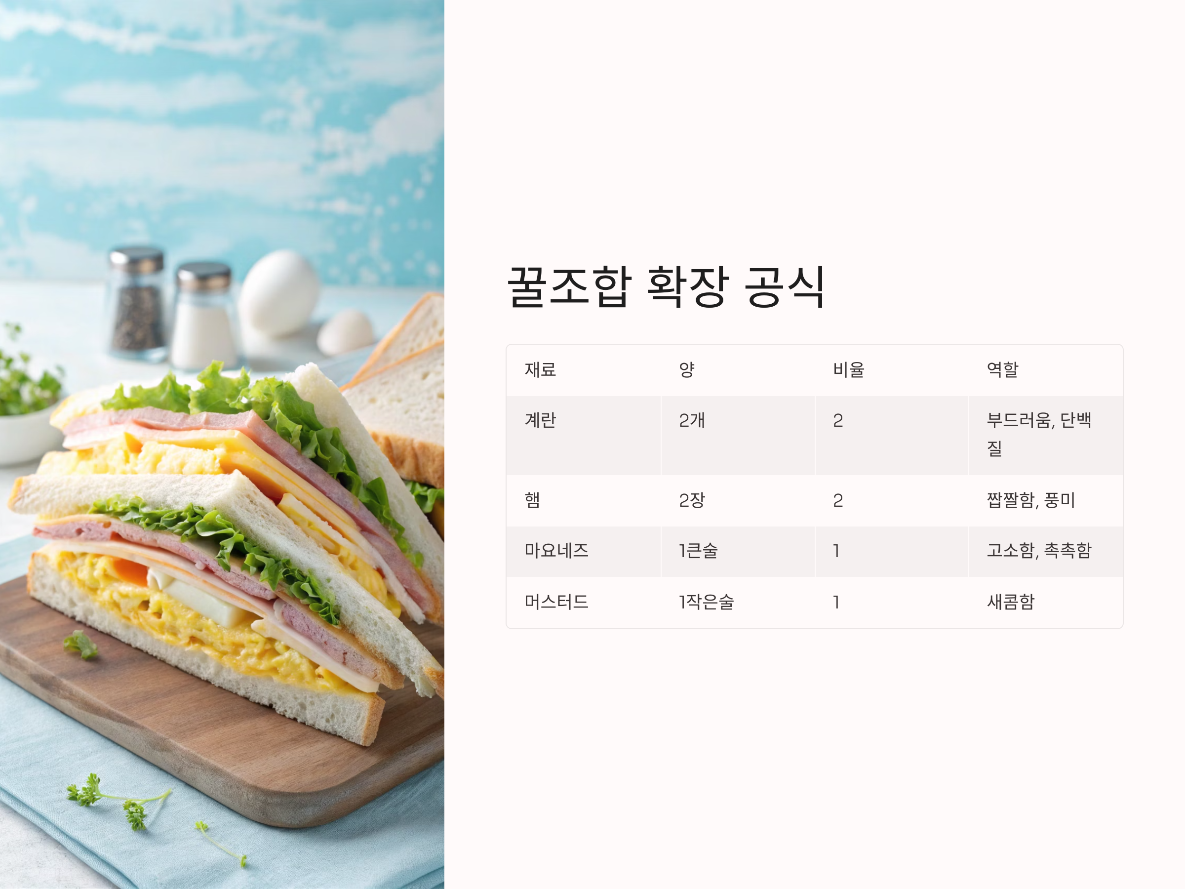 샌드위치의 가장 기본이자 인기 조합인 계란과 햄은 간단한 듯하지만 재료의 비율과 배합에 따라 맛의 완성도가 크게 달라집니다.