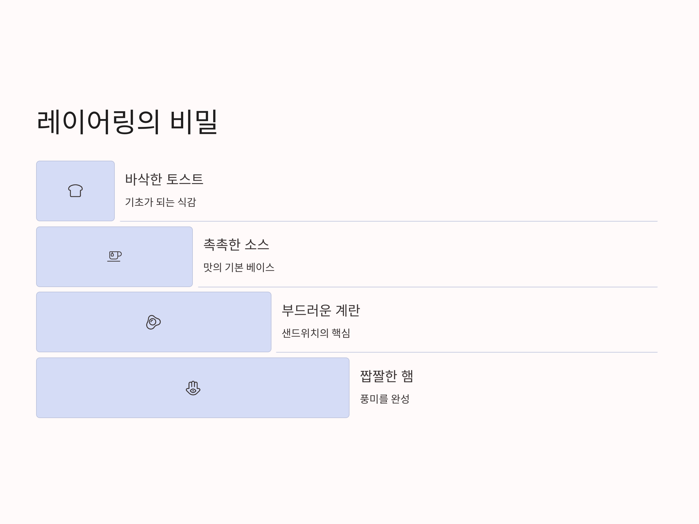 이 구조는 재료가 흘러내리지 않으면서도 풍미를 층층이 즐길 수 있는 배치입니다.