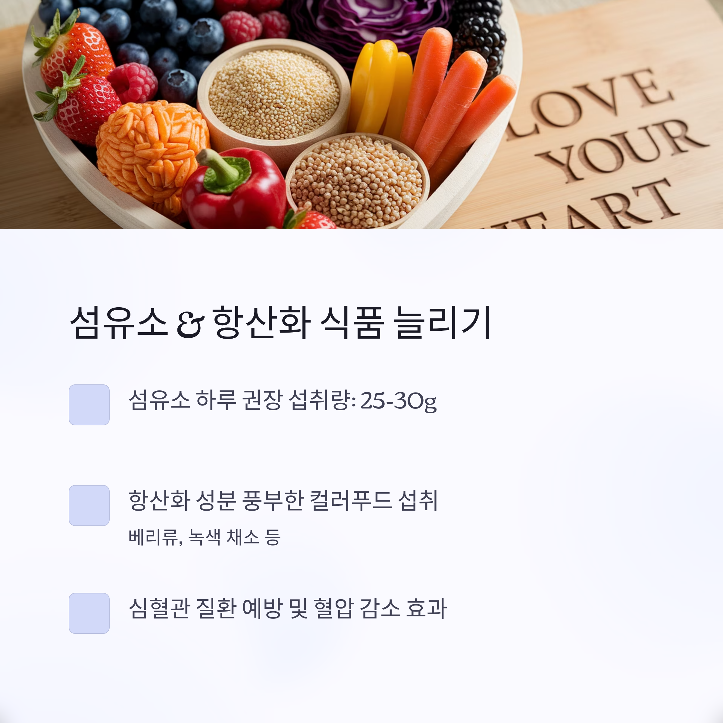 | 심장 건강 핵심 | 콜레스테롤과 염분을 줄이고, 항산화 영양소 섭취 증가 |