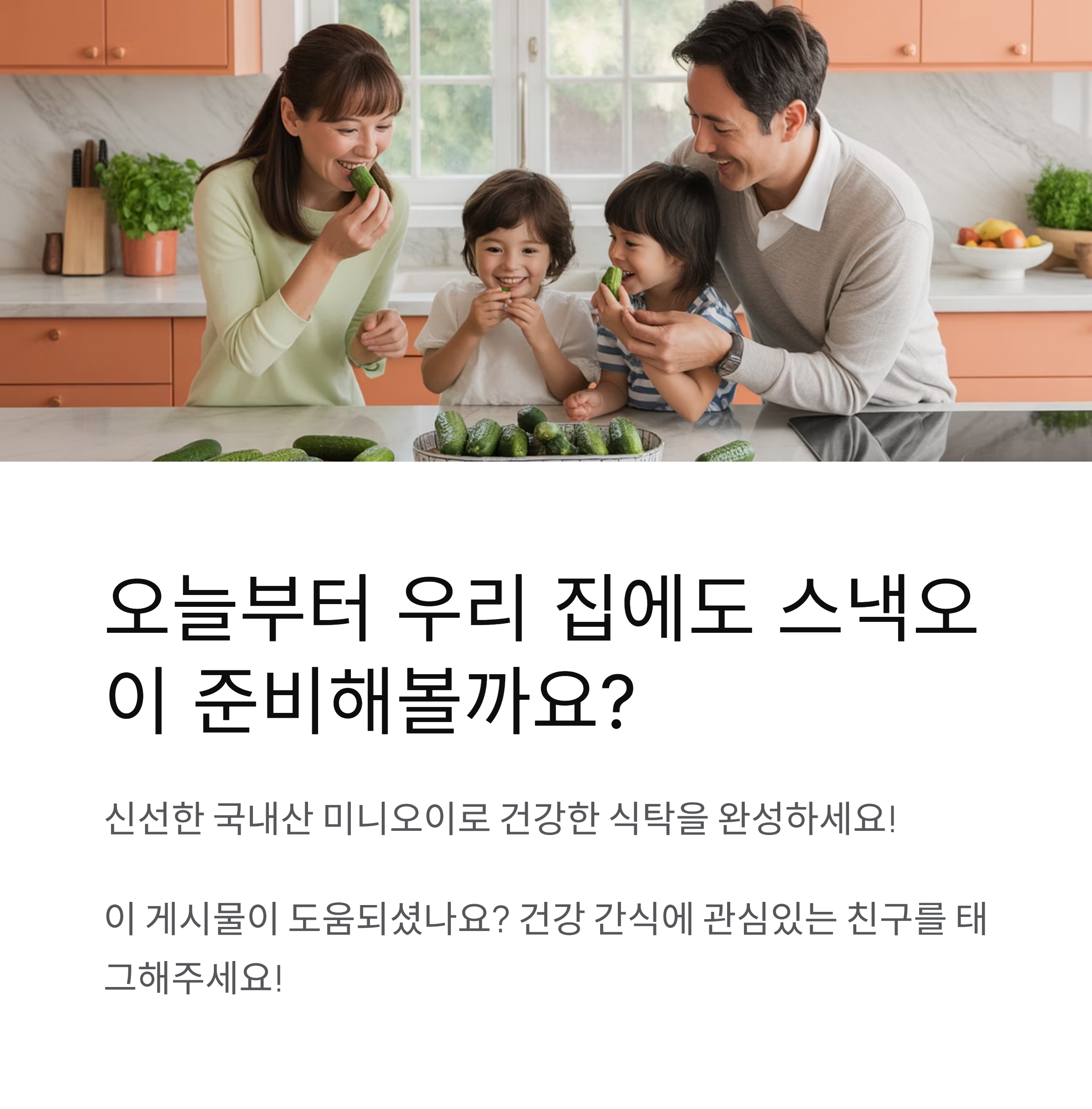 국내산으로 재배된 아삭아삭한 스낵오이는 작은 크기 덕분에 간식용, 피클용으로 사랑받고 있습니다.