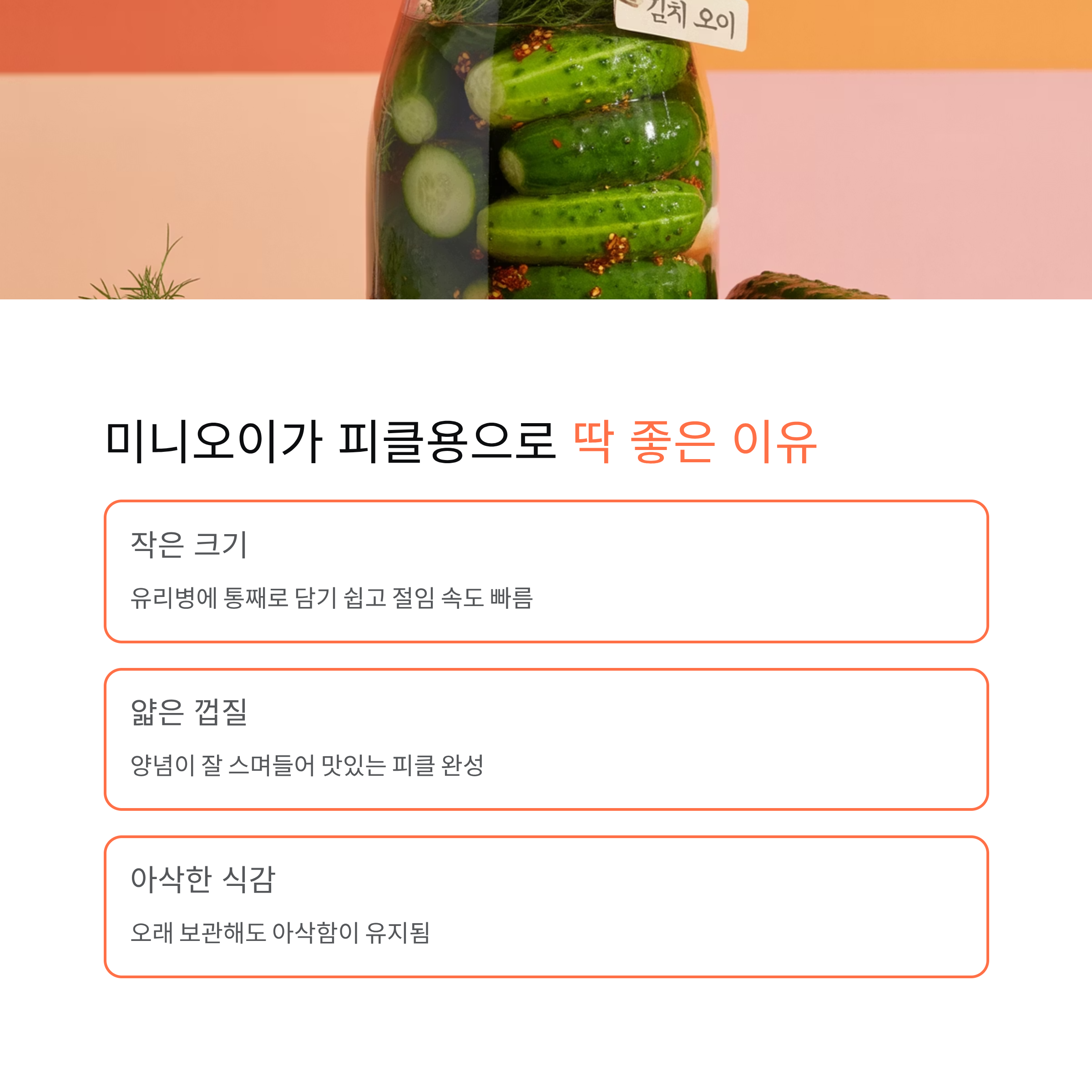 오이가 작아 유리병이나 밀폐 용기에 담기 쉽고 절임 속도가 빠릅니다.