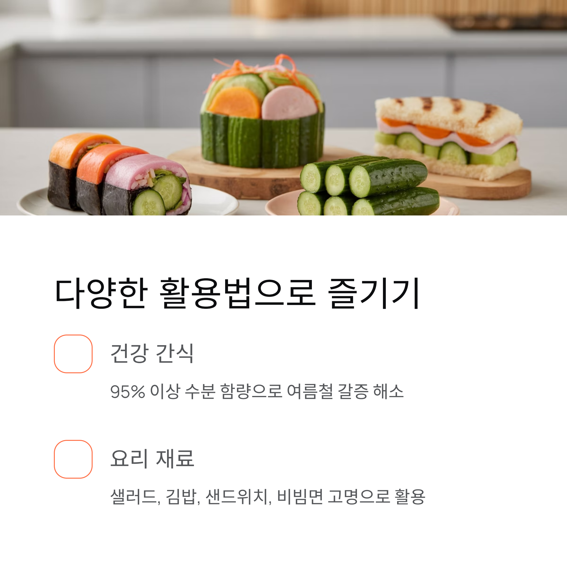 2kg 또는 4kg 구성을 상황에 맞게 선택해 가정에서도 신선한 오이를 다양하게 즐겨보시기 바랍니다.