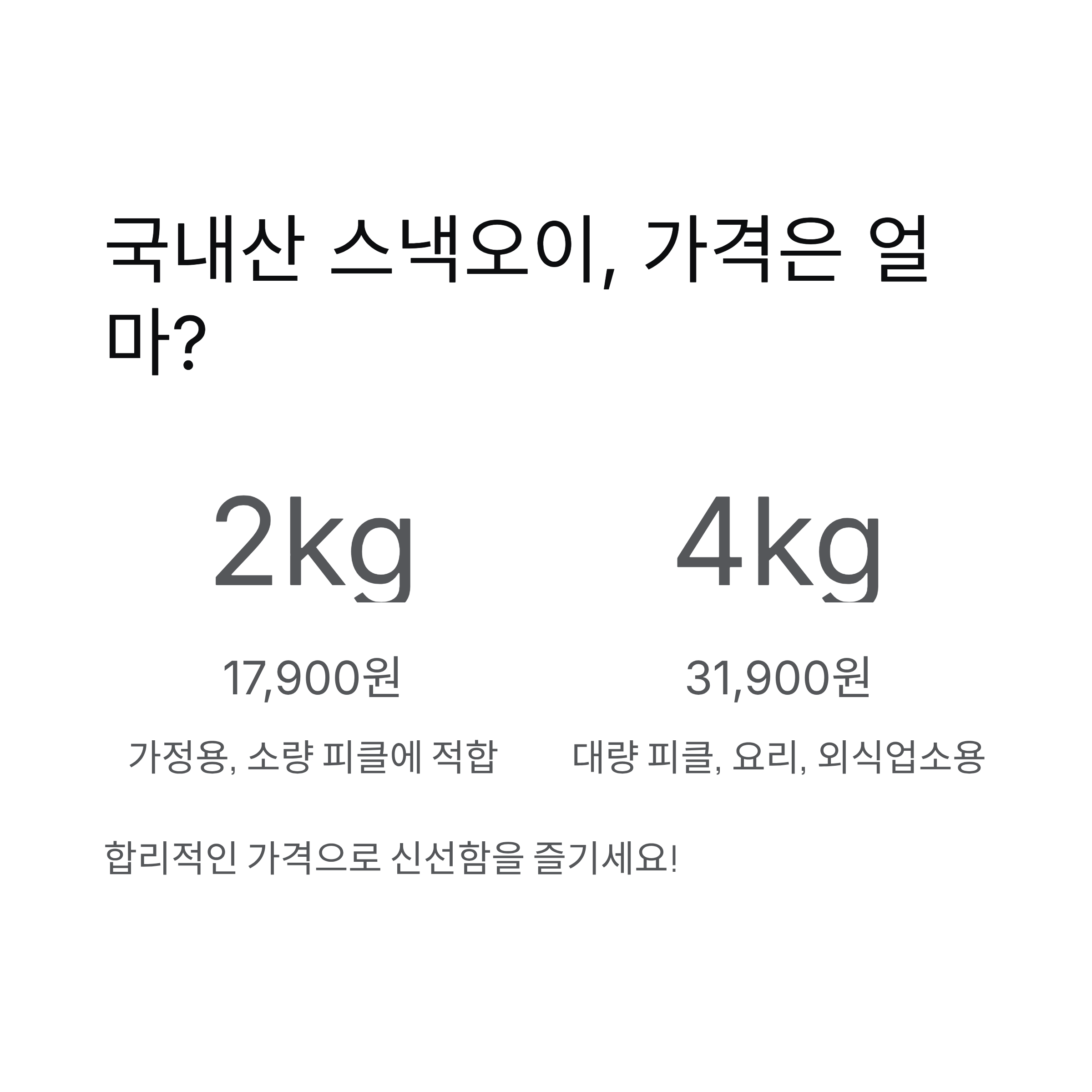 2kg 17,900원, 4kg 31,900원으로 합리적인 가격대에 만나볼 수 있으며, 신선도와 활용도가 뛰어납니다.