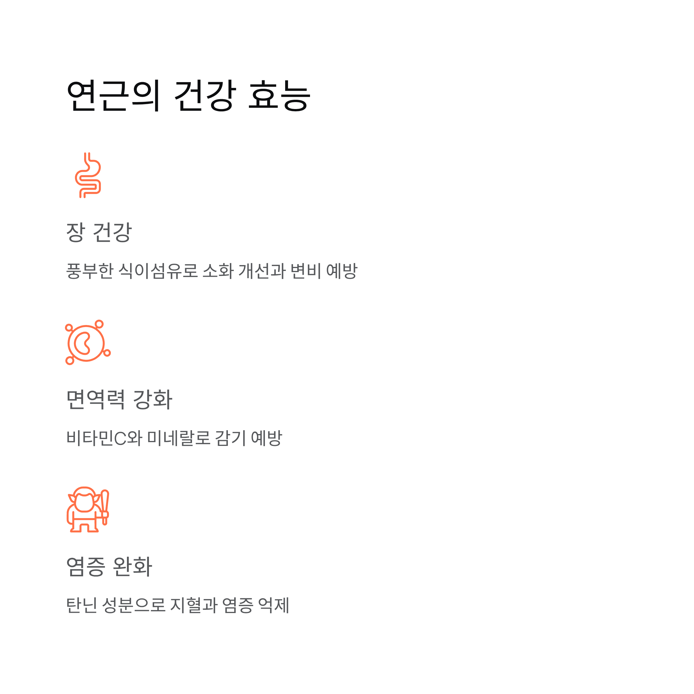 연근은 식이섬유가 풍부해 장 건강에 도움을 주며, 탄닌 성분 덕분에 지혈 작용과 염증 완화에도 유익합니다.