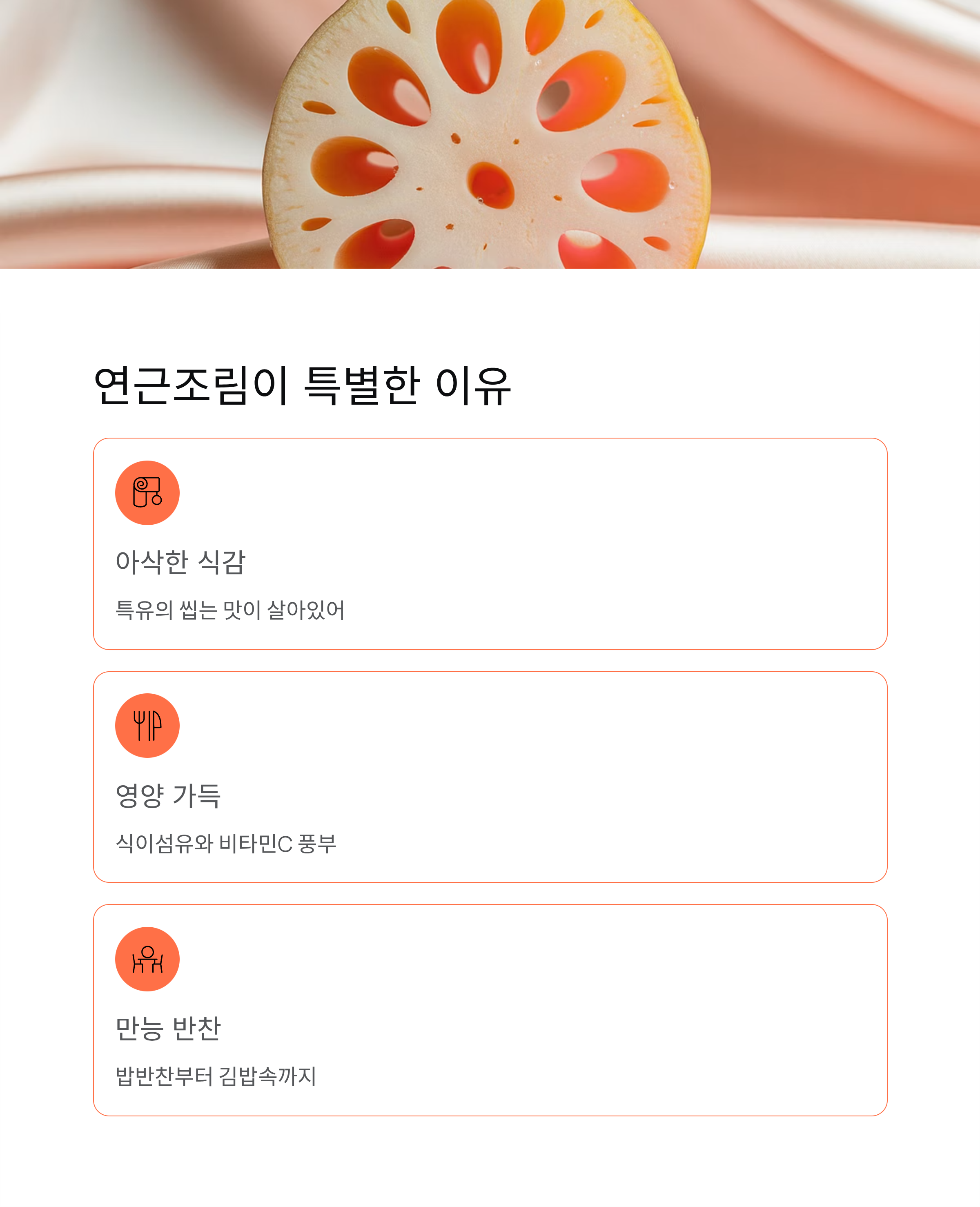 달짝지근하면서도 짭조름한 양념이 연근 특유의 아삭한 식감과 만나 입맛을 돋워주지요.