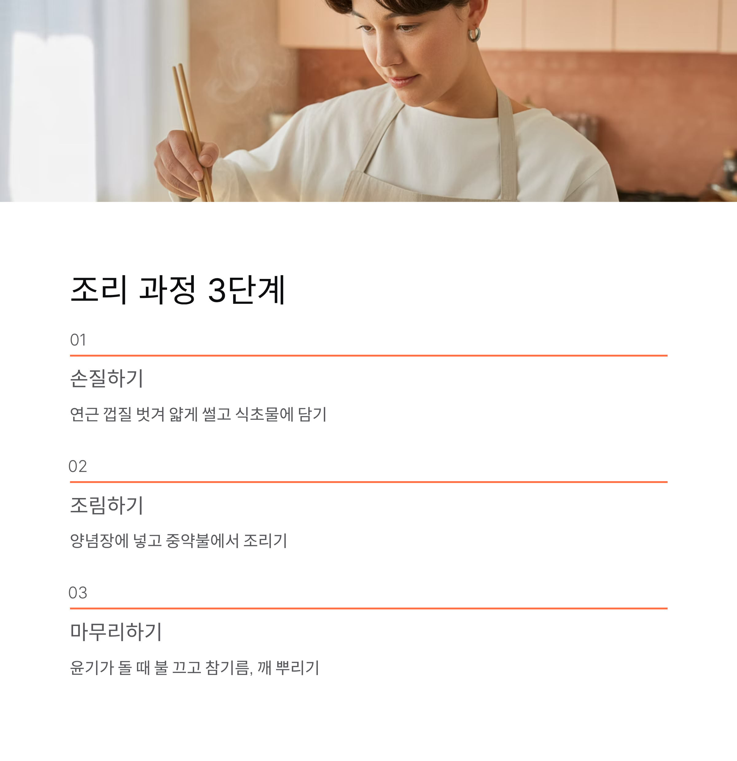 연근조림은 단계별로 나누어 준비하면 훨씬 간단합니다.