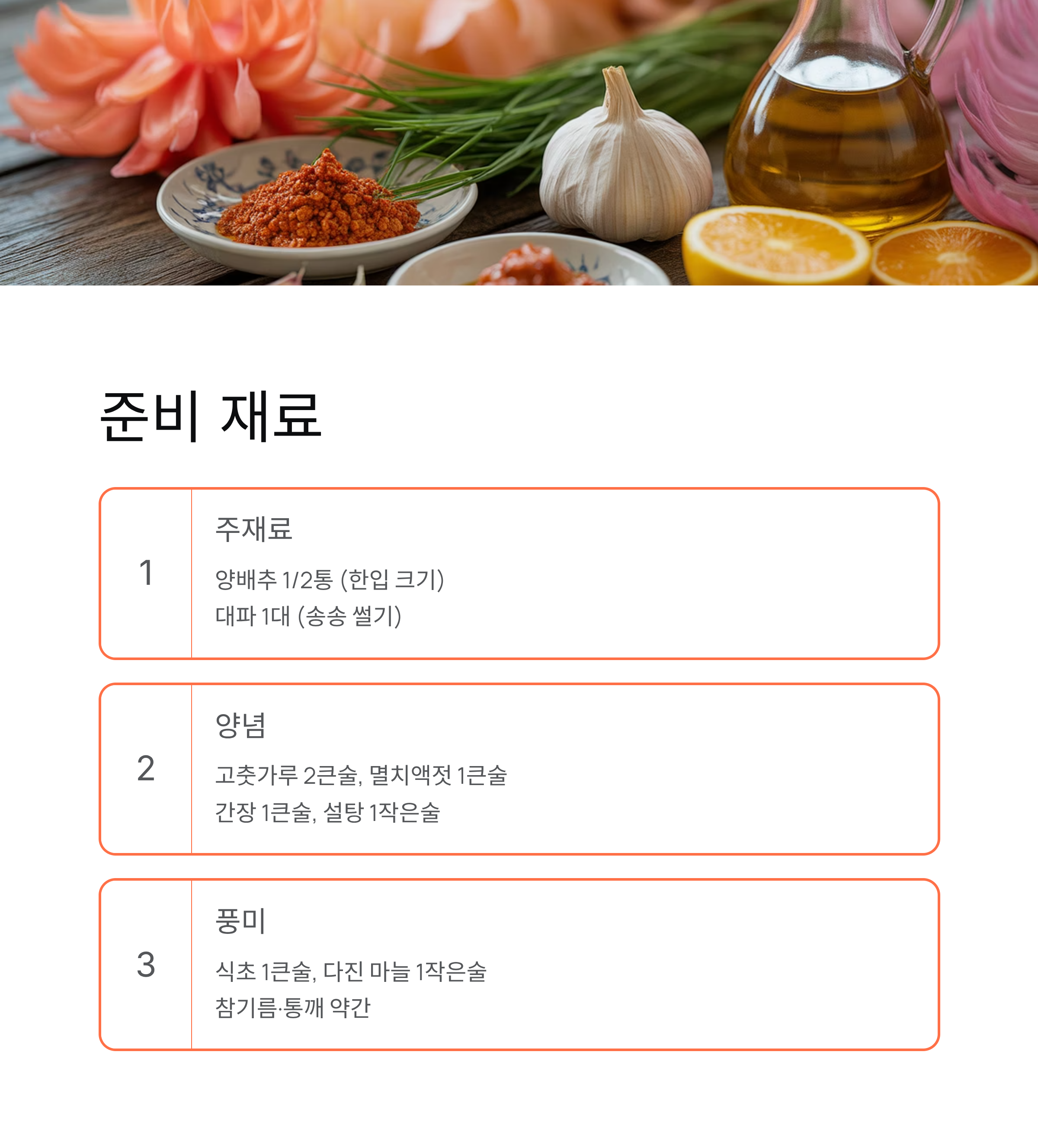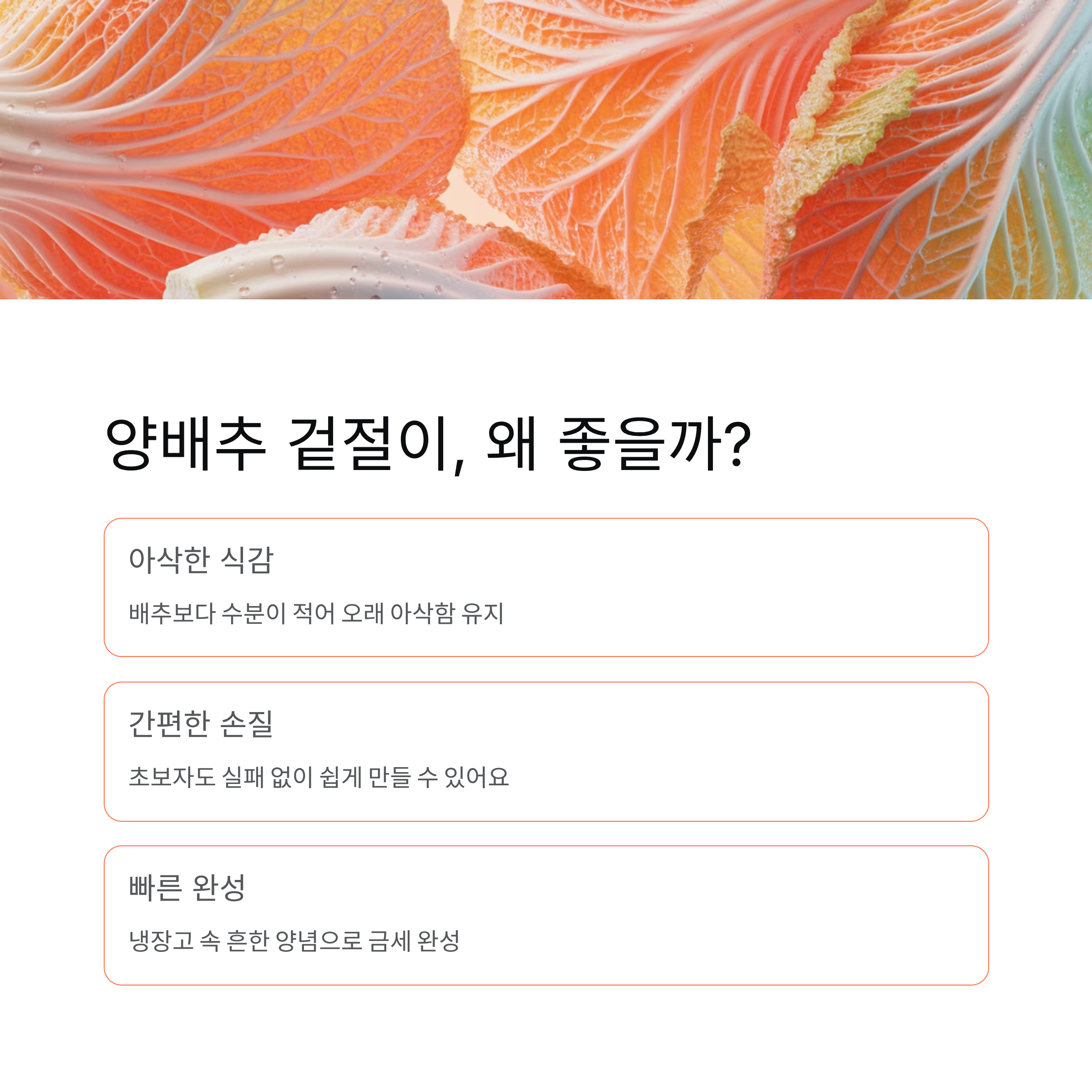 양배추는 배추보다 수분이 적어 양념이 잘 배면서도 아삭한 식감을 오래 유지합니다. 또한 손질이 간단해 초보자도 실패 없이 만들 수 있습니다. 냉장고 속 흔한 양념만으로도 금세 완성되는 효자 반찬이죠.