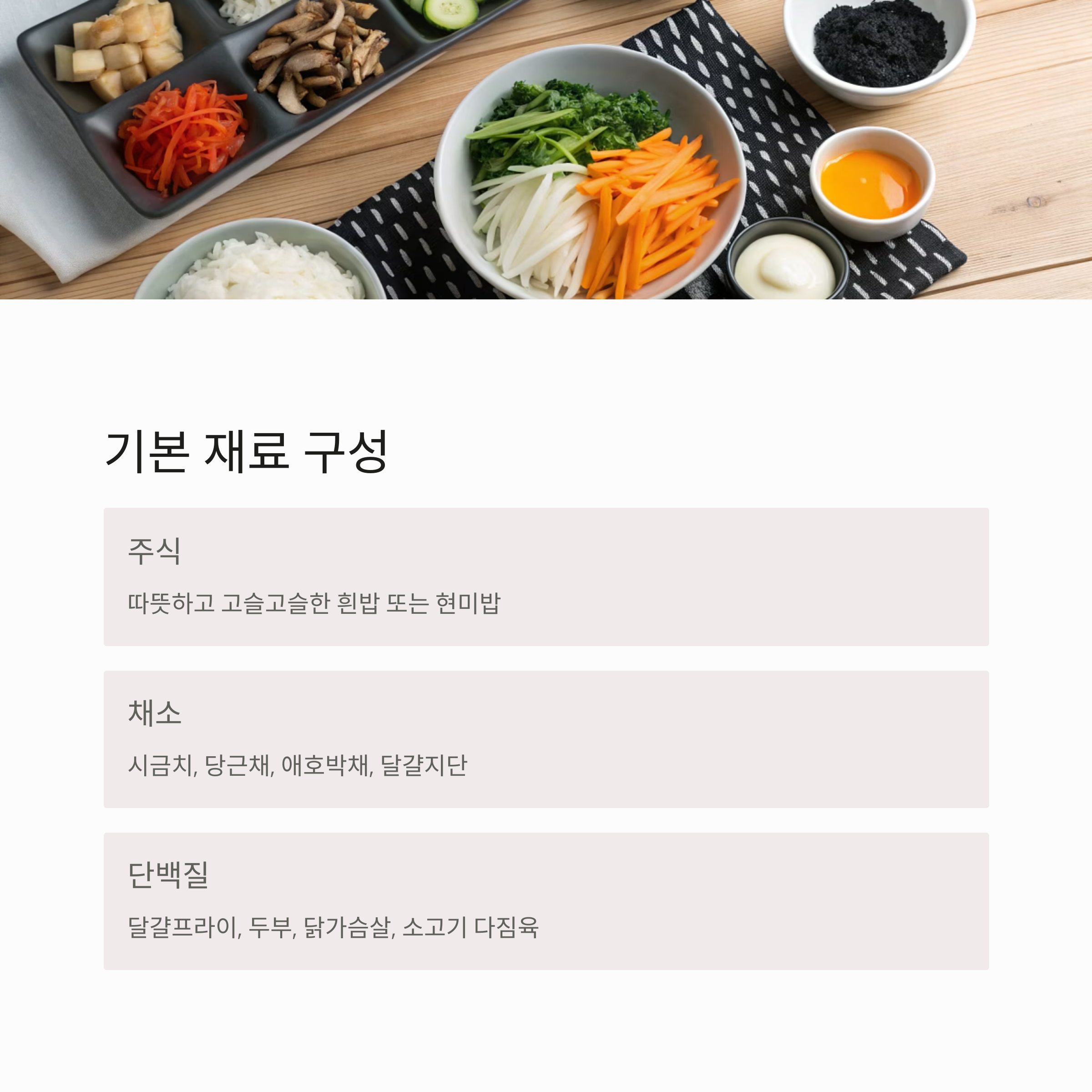 | 단백질 | 달걀프라이, 두부, 닭가슴살, 소고기 다짐육 등 |