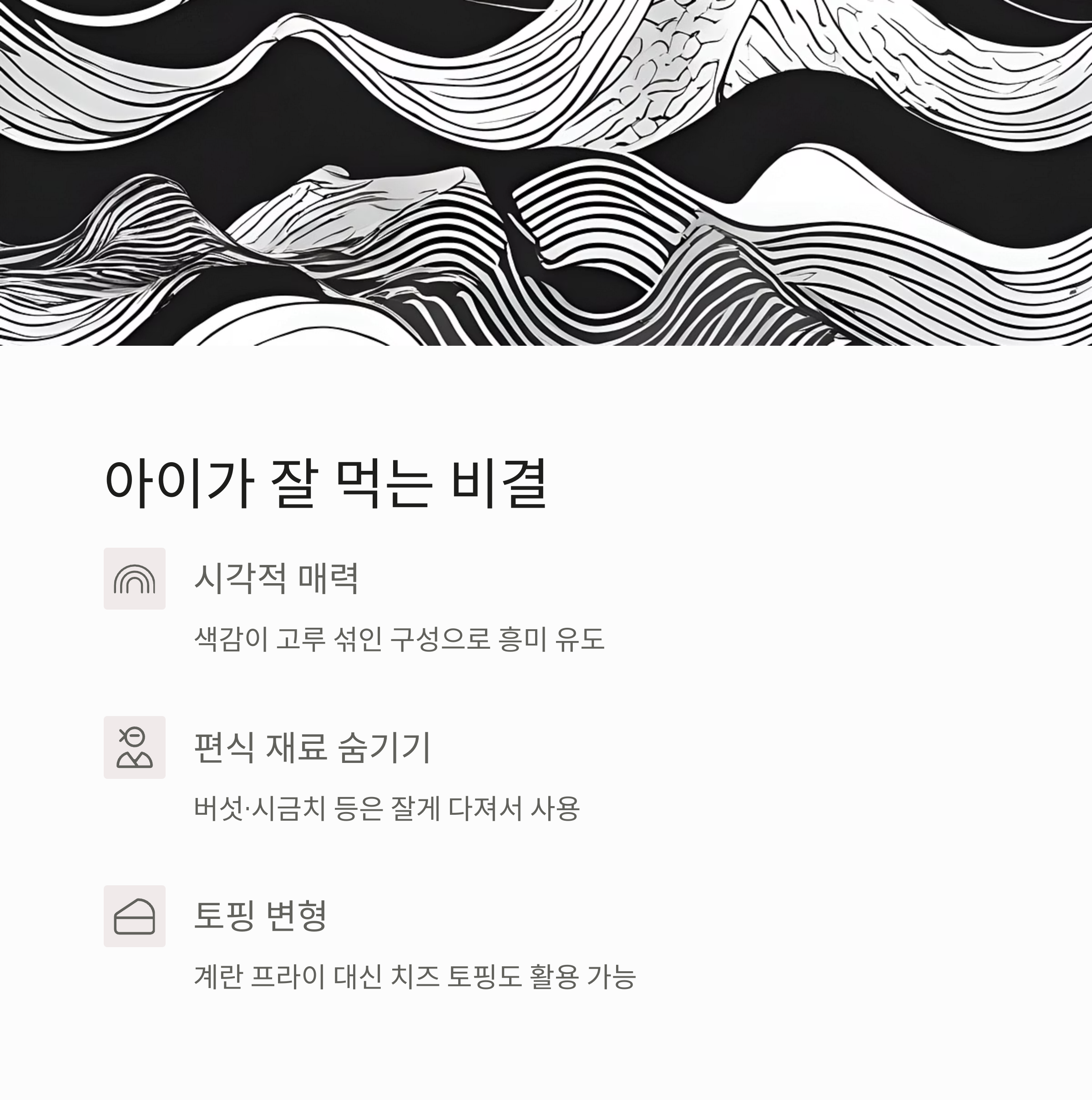 - 버섯·시금치 등 편식 재료는 다져서 숨기듯 사용