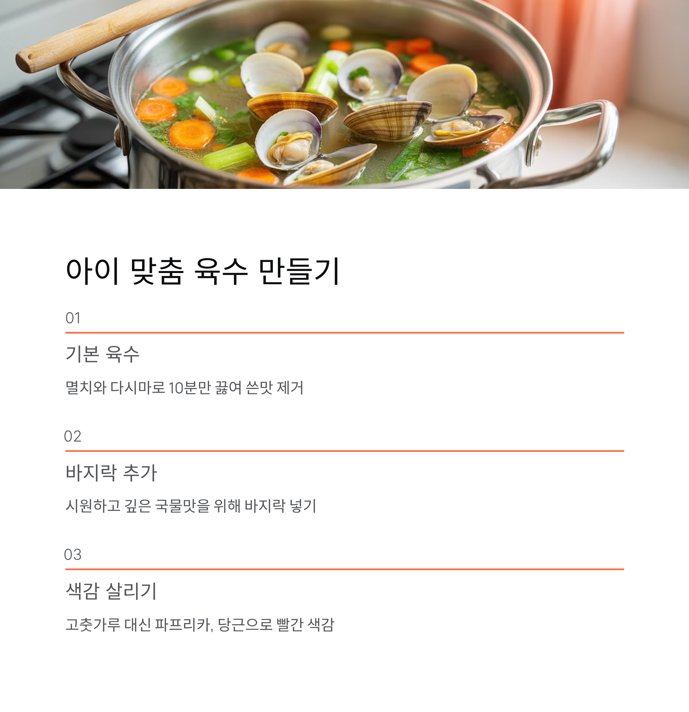 | 육수 | 멸치·다시마 + 바지락으로 시원하게 |