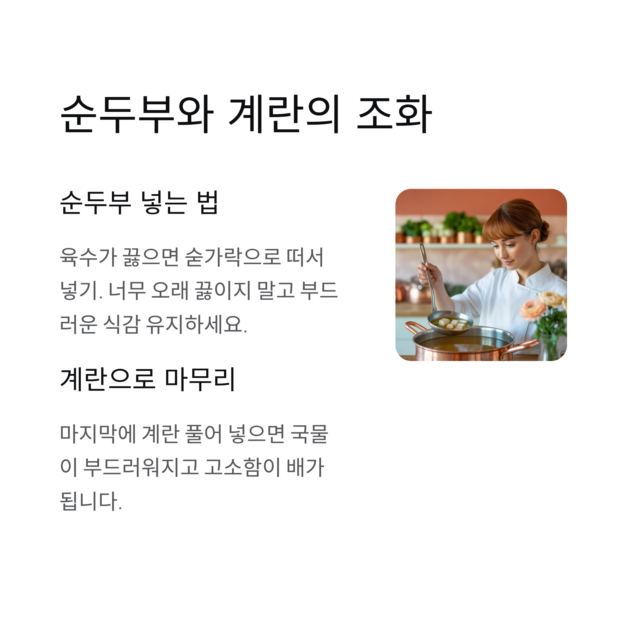 순두부는 너무 오래 끓이지 않아야 부드러운 식감이 유지됩니다.