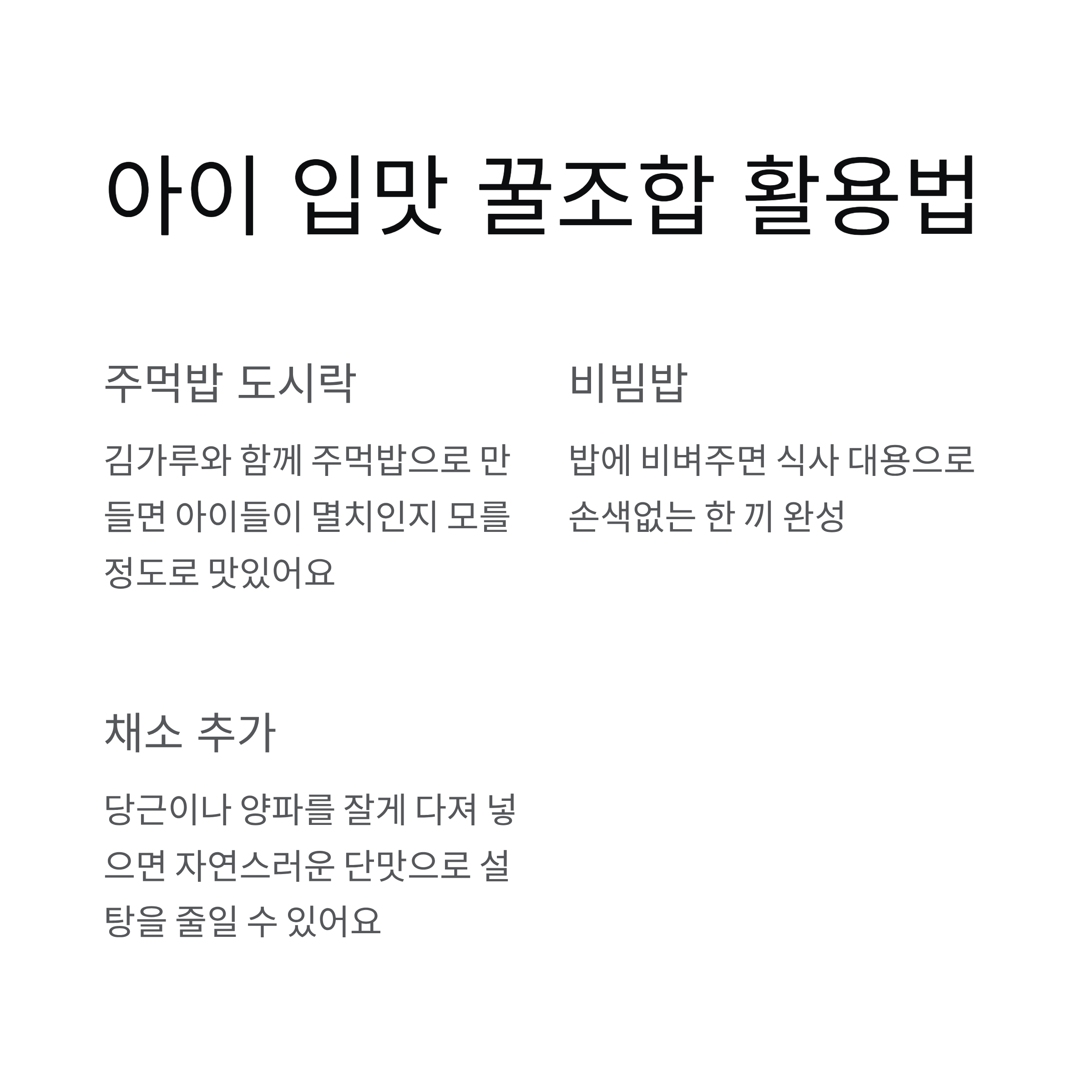 또 김가루와 함께 주먹밥으로 만들어 도시락 반찬으로 활용해보세요.