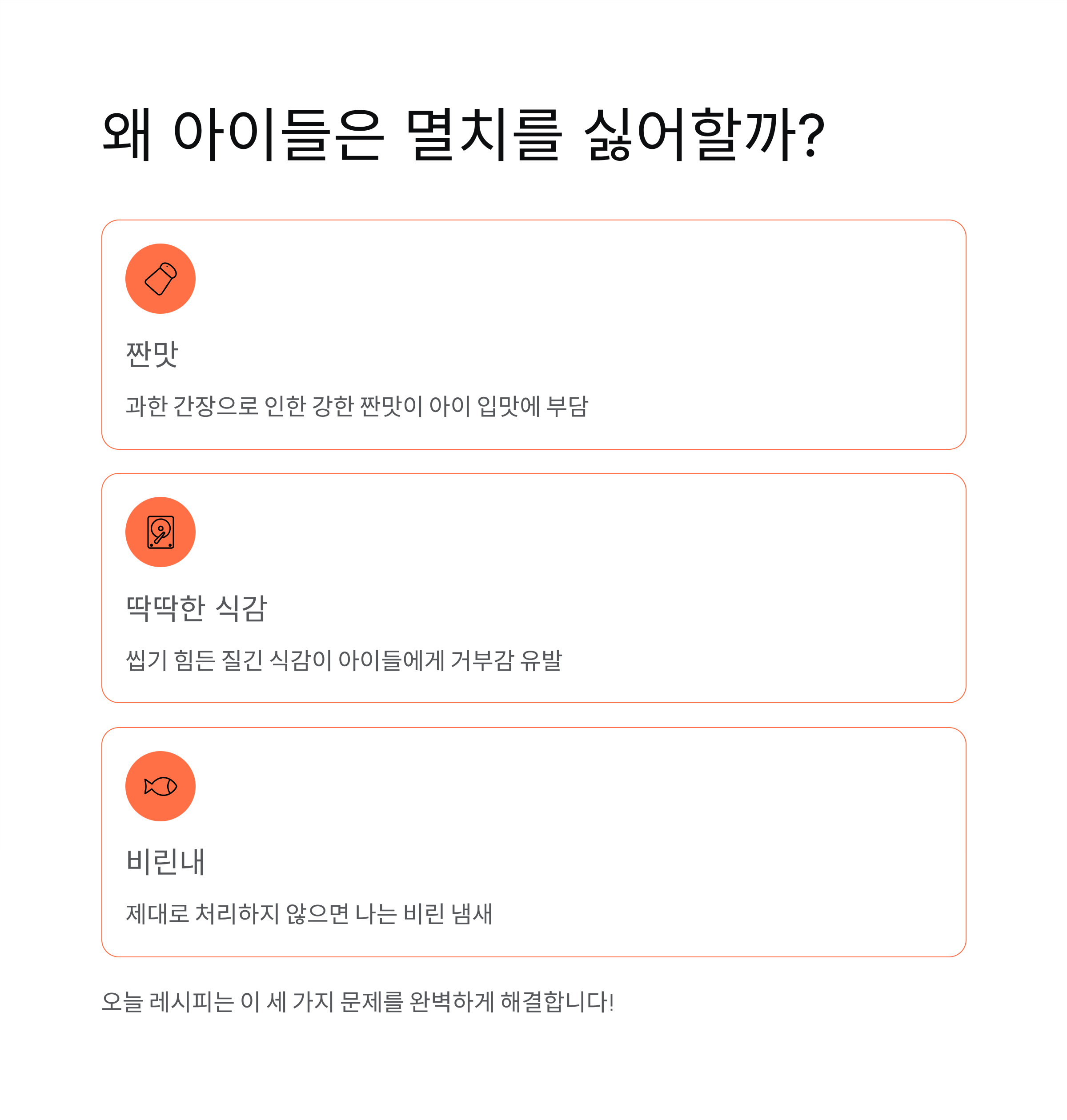 아이들이 멸치볶음을 싫어하는 가장 큰 이유는 ‘짠맛’과 ‘딱딱한 식감’이에요.
