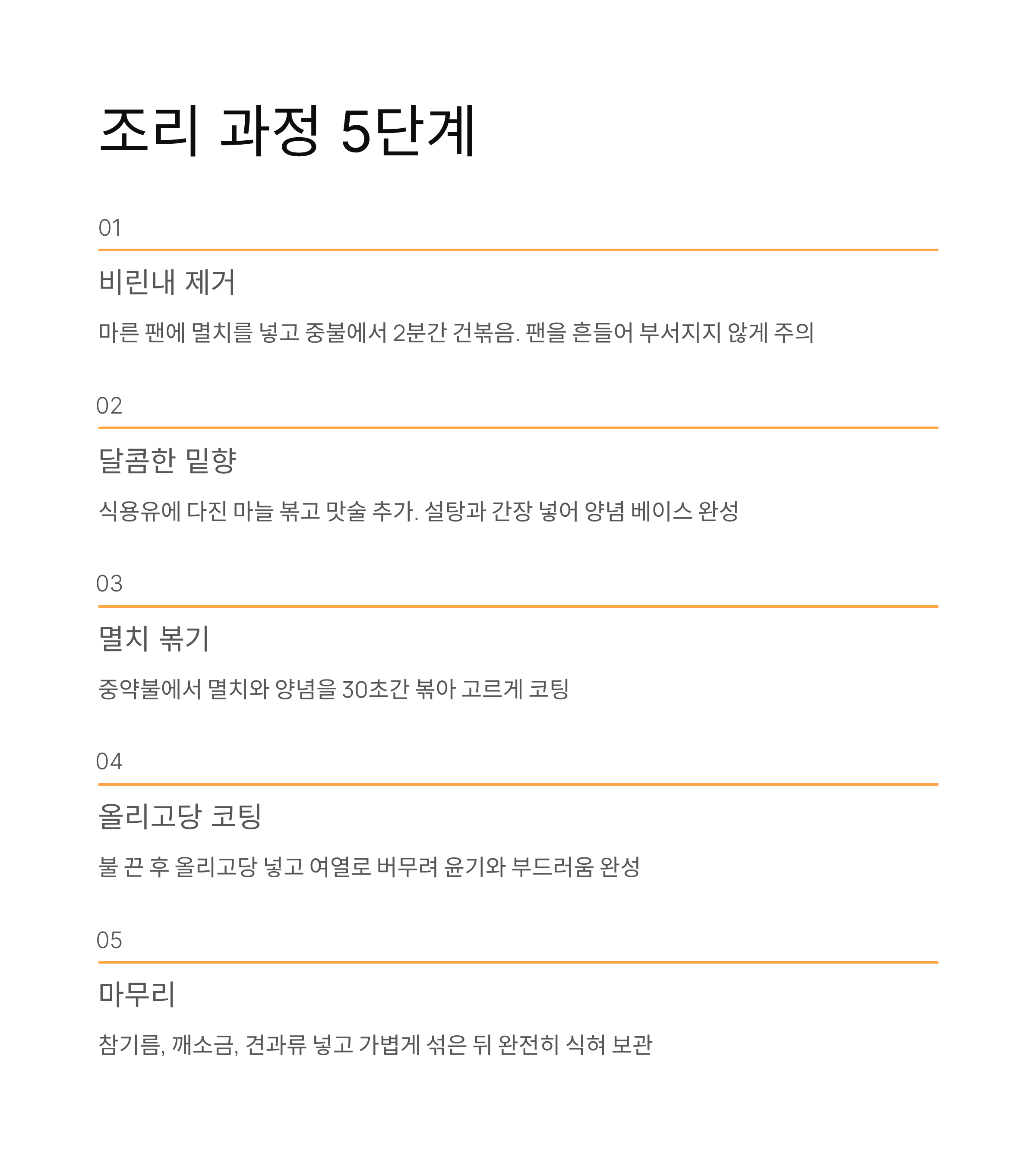 | 3 | 멸치 넣고 짧게 볶기 | 중약불 |