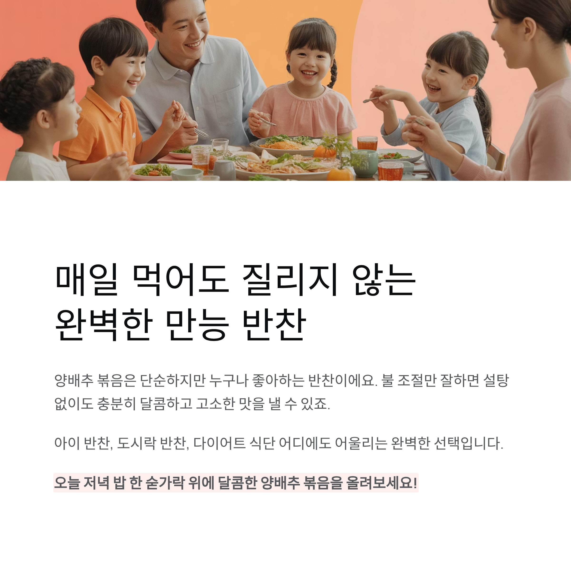 아이 밥상에 올릴 반찬을 고민할 때, 맵지 않고 부드러우며 달콤한 맛이 나는 반찬이 딱 좋죠. 그런 의미에서 양배추 볶음은 완벽한 선택이에요. 달큰하고 촉촉한 식감 덕분에 채소를 잘 먹지 않는 아이들도 숟가락이 절로 가는 마법 같은 반찬이랍니다.