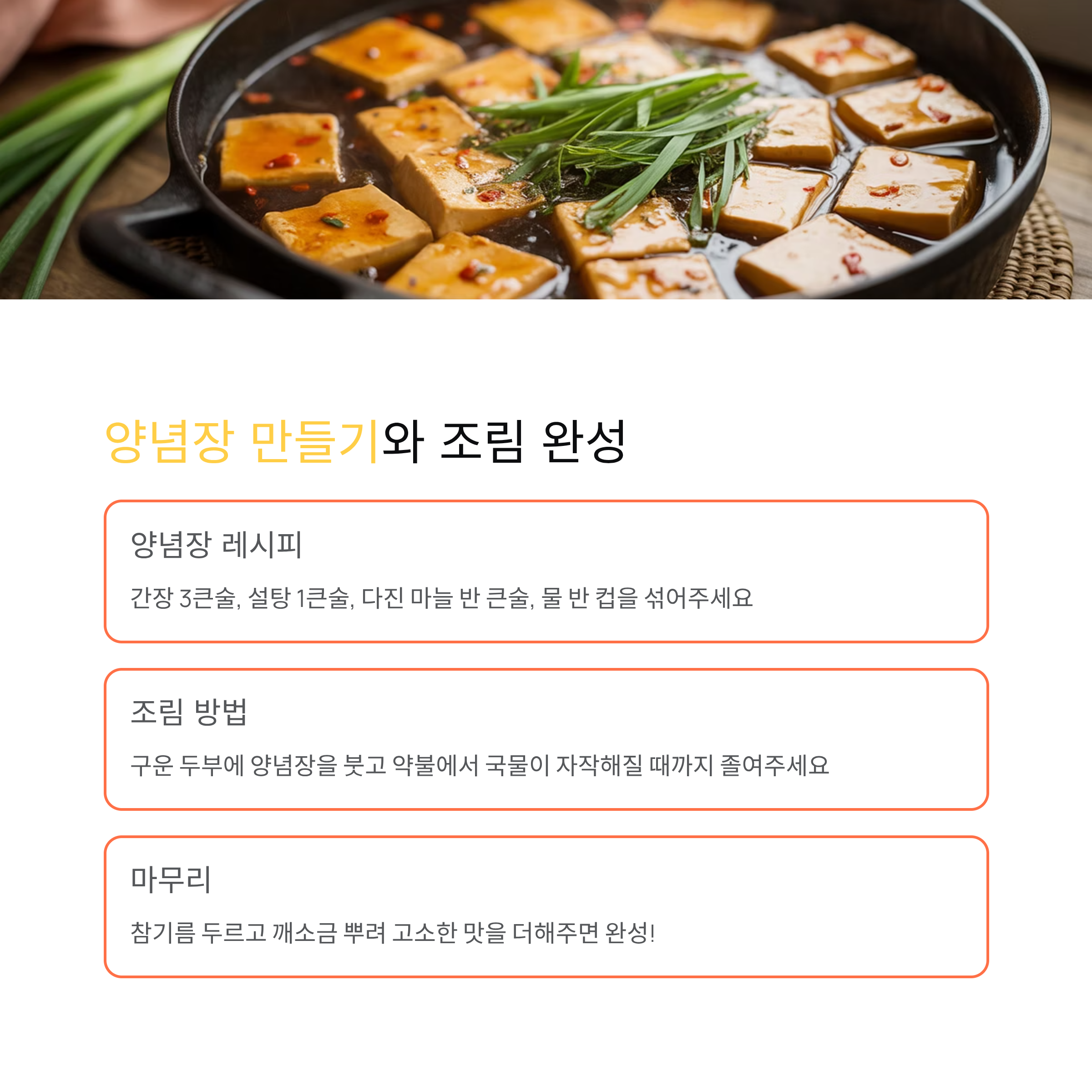 짭조름하면서도 담백한 두부조림은 아이와 어른 모두 좋아하는 국민 반찬입니다.