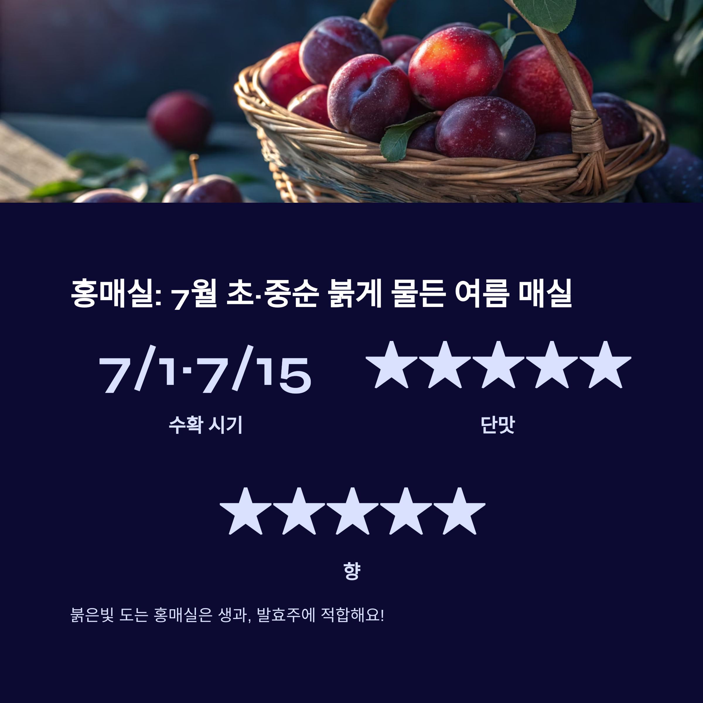 | 홍매실 | 7월 초~중순 | 붉은색 섞임 | 향 깊고 감미 | 발효, 생과 |