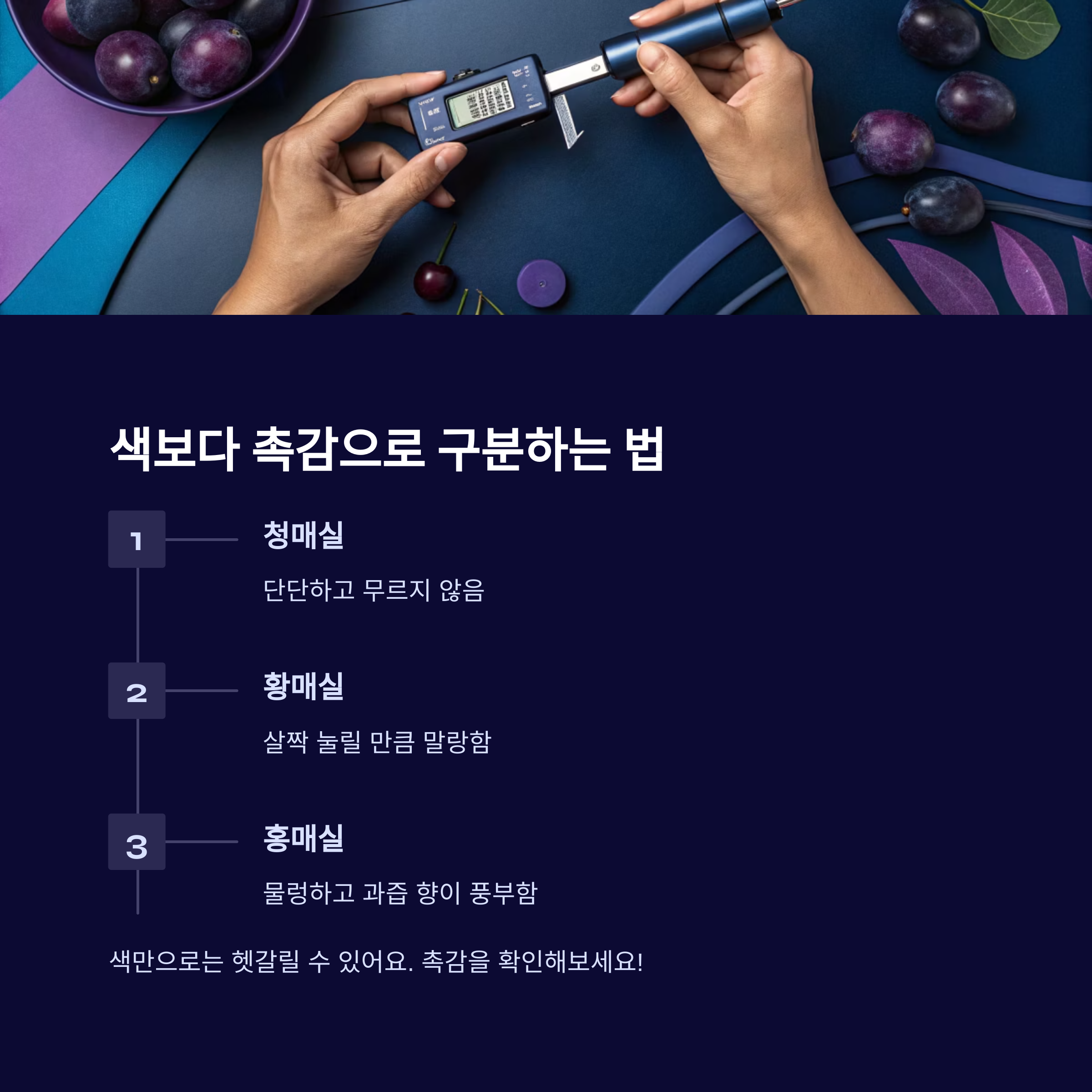 손에 들었을 때 과즙 향이 퍼지고 물렁하면 홍매실입니다.