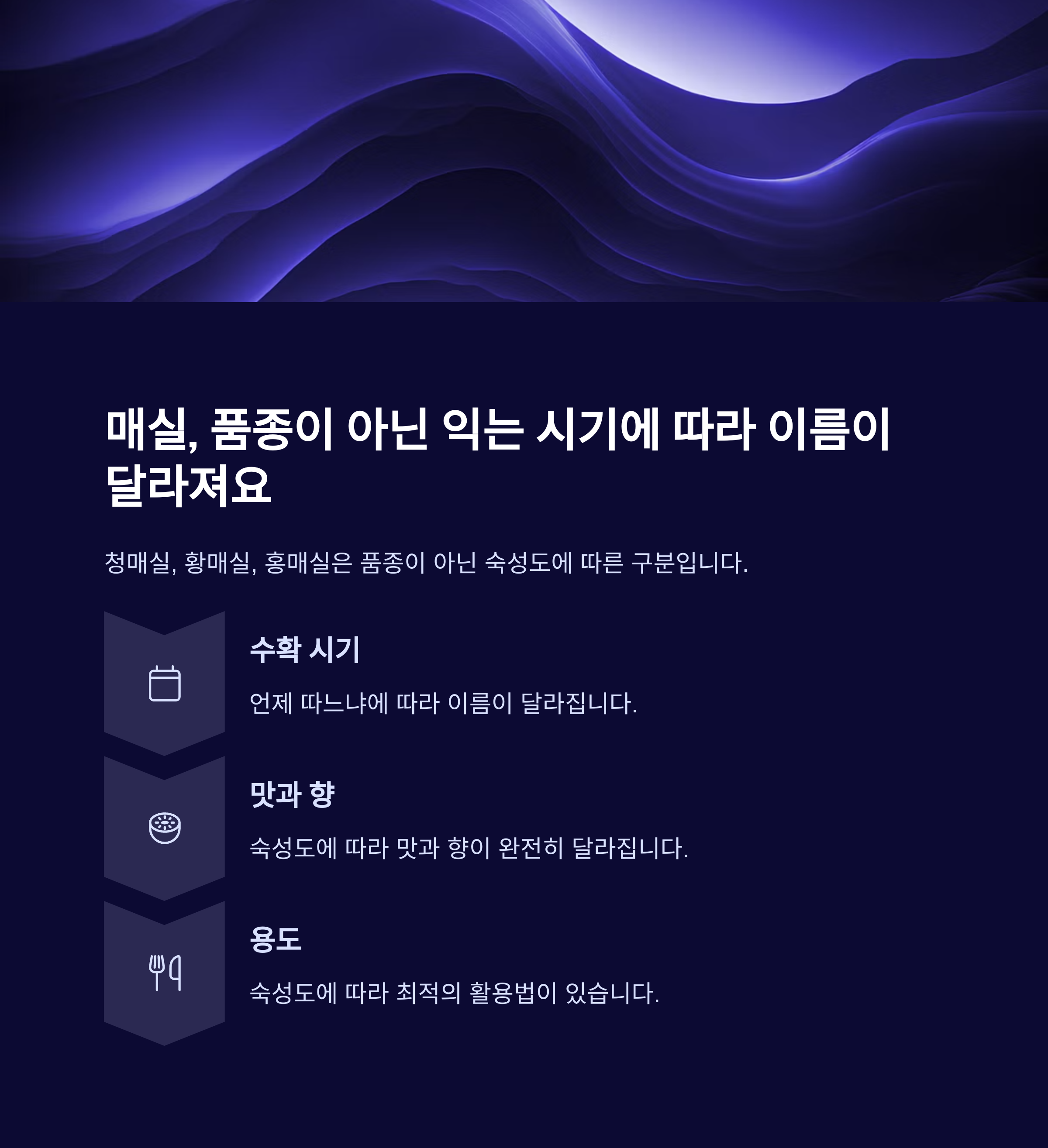 사실 세 매실은 '품종'이 아니라 '익는 시기'와 '숙성도'에 따라 부르는 이름입니다.