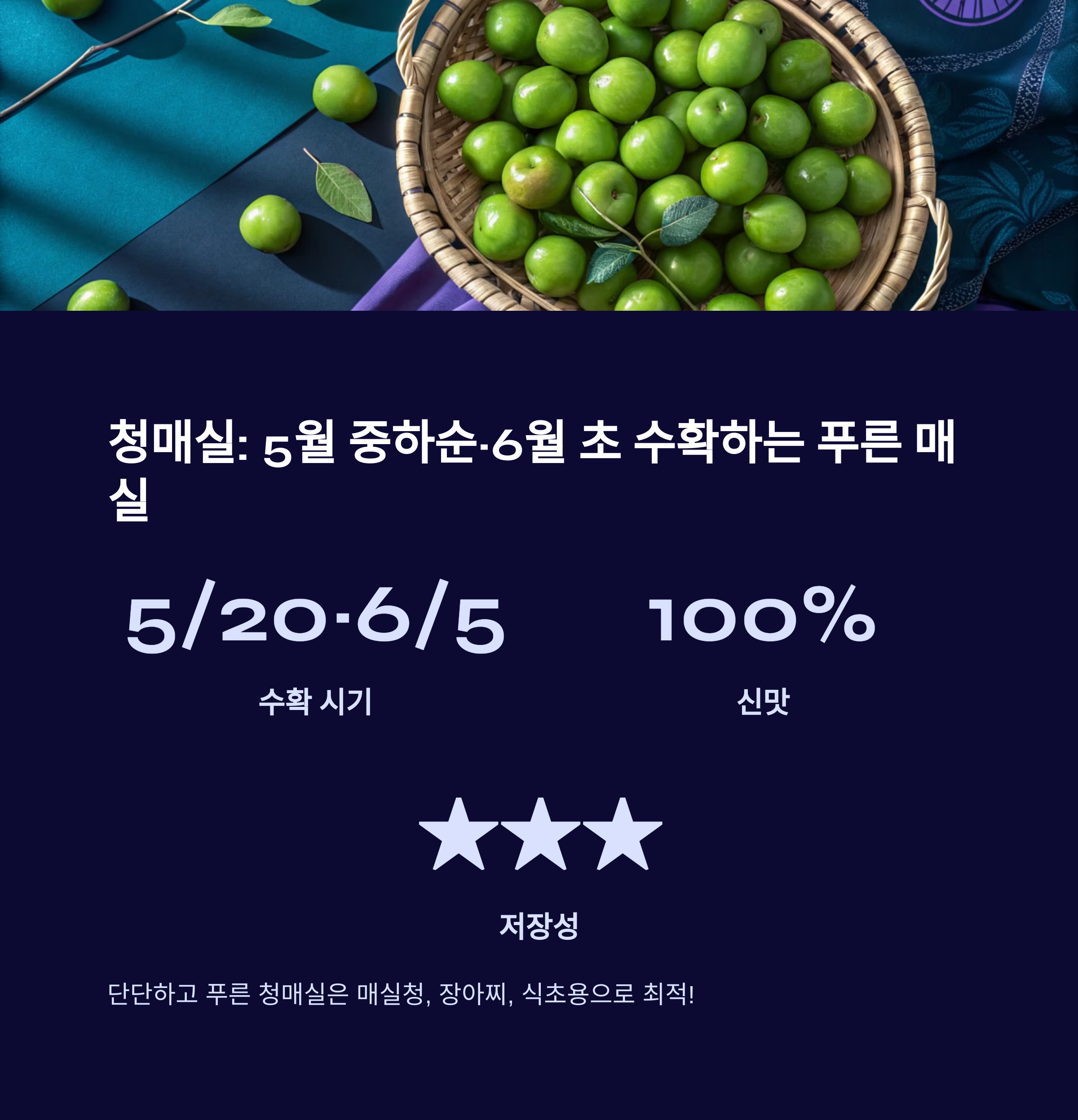 신맛이 강하고 단단해서 매실청, 장아찌용으로 가장 많이 사용됩니다.