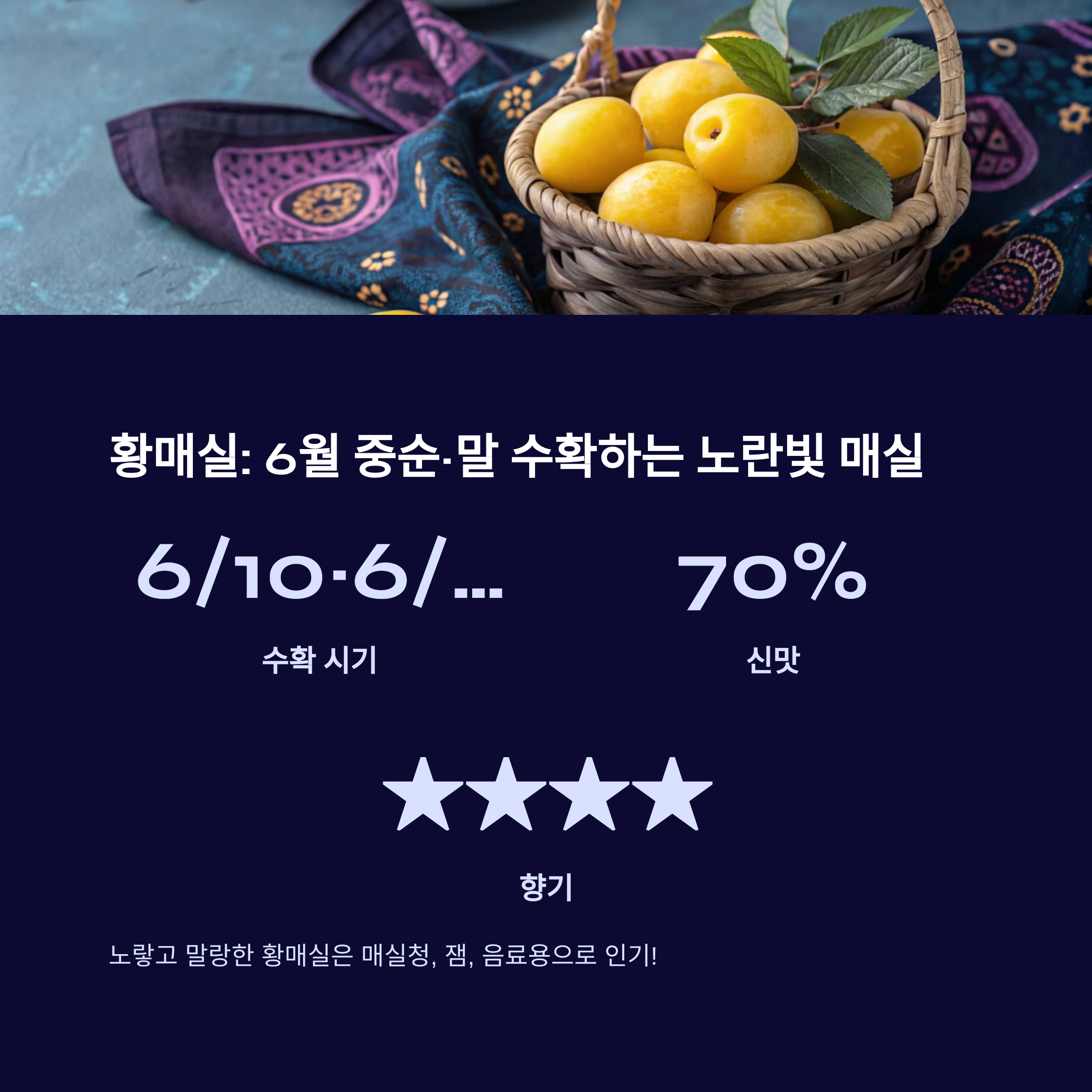 | 황매실 | 6월 중순~말 | 노란빛, 말랑함 | 단맛+향 | 청, 잼 |