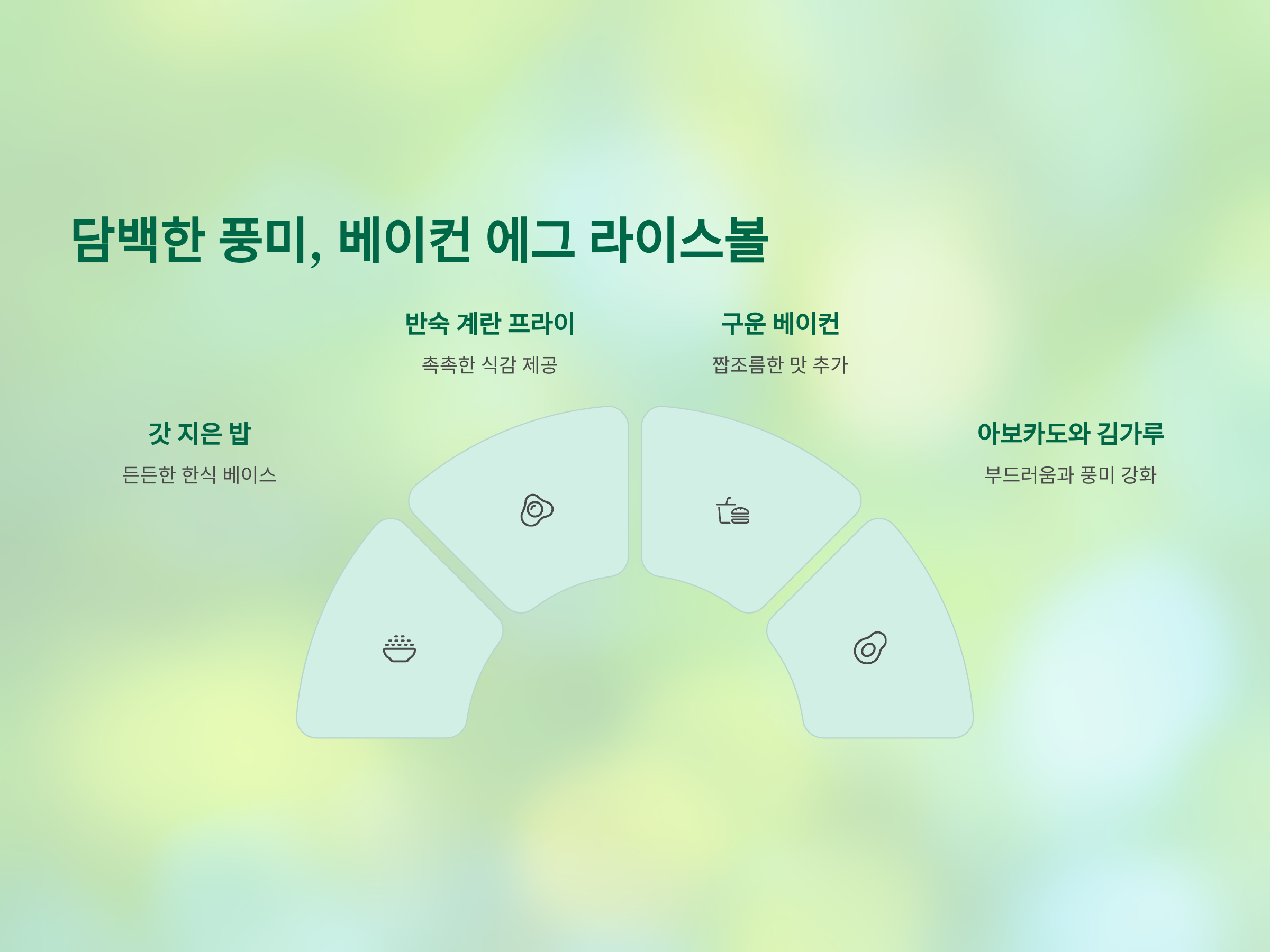 | 에그 라이스볼 | 밥, 계란, 베이컨, 아보카도, 김가루 | 한식 스타일 든든한 한 끼 |