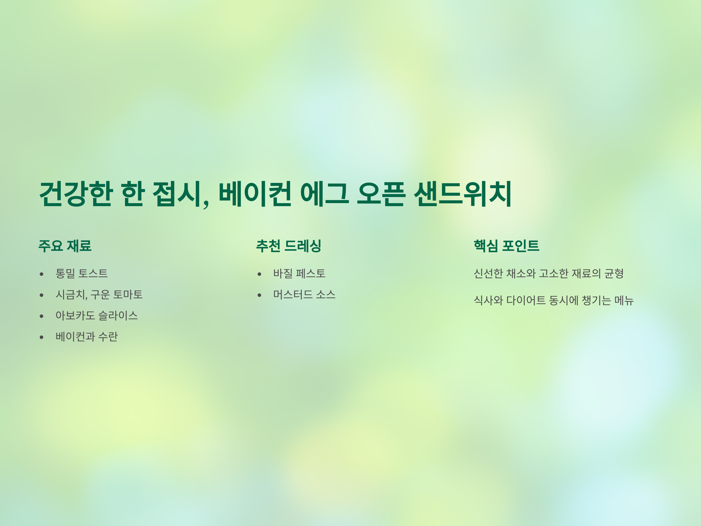 | 오픈 샌드위치 | 토스트, 채소, 베이컨, 계란 | 건강하고 화려한 비주얼 |