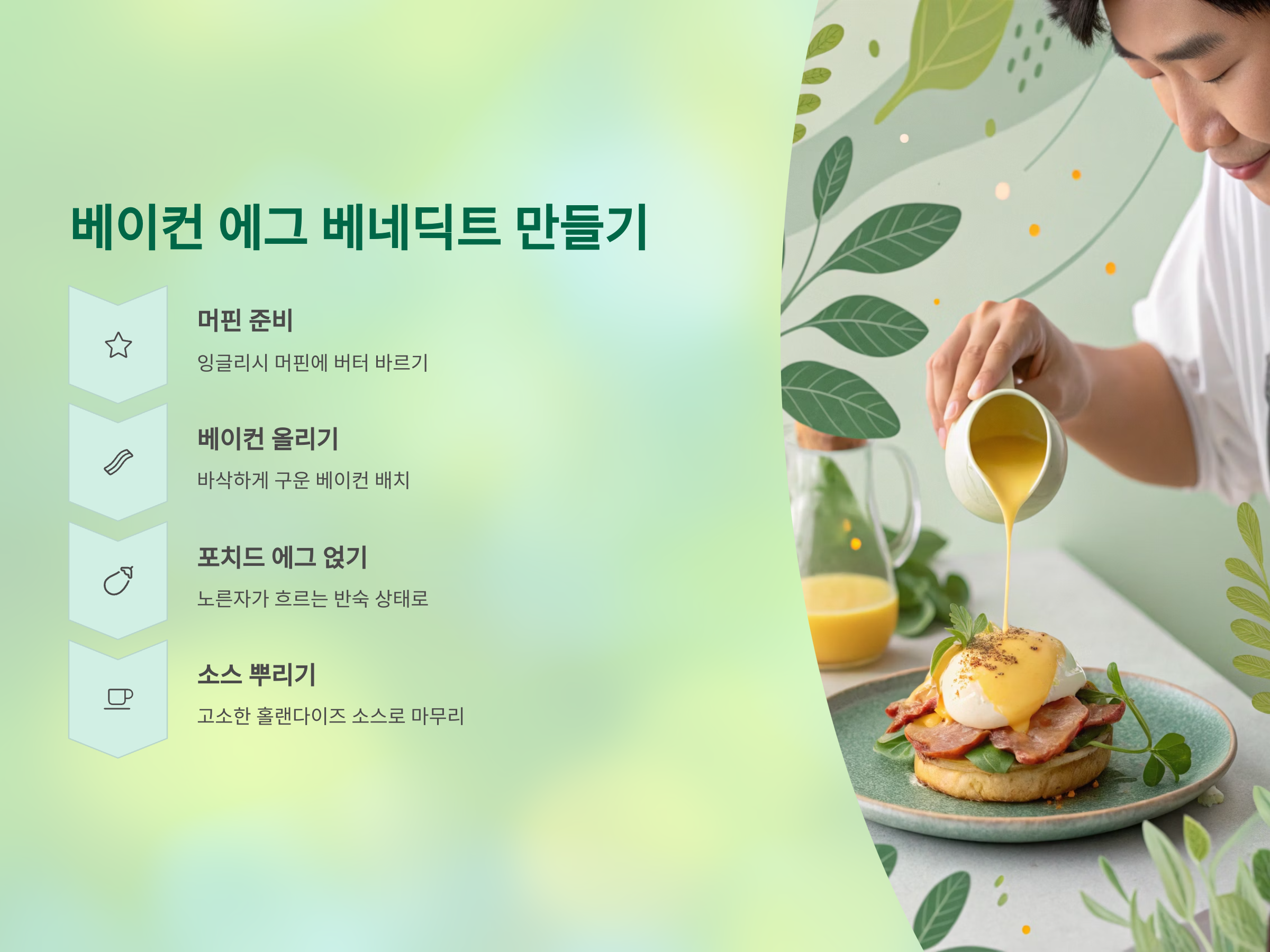 잉글리시 머핀 위에 버터를 바르고, 구운 베이컨과 포치드 에그를 올린 뒤 홀랜다이즈 소스를 부어주면 완성됩니다.