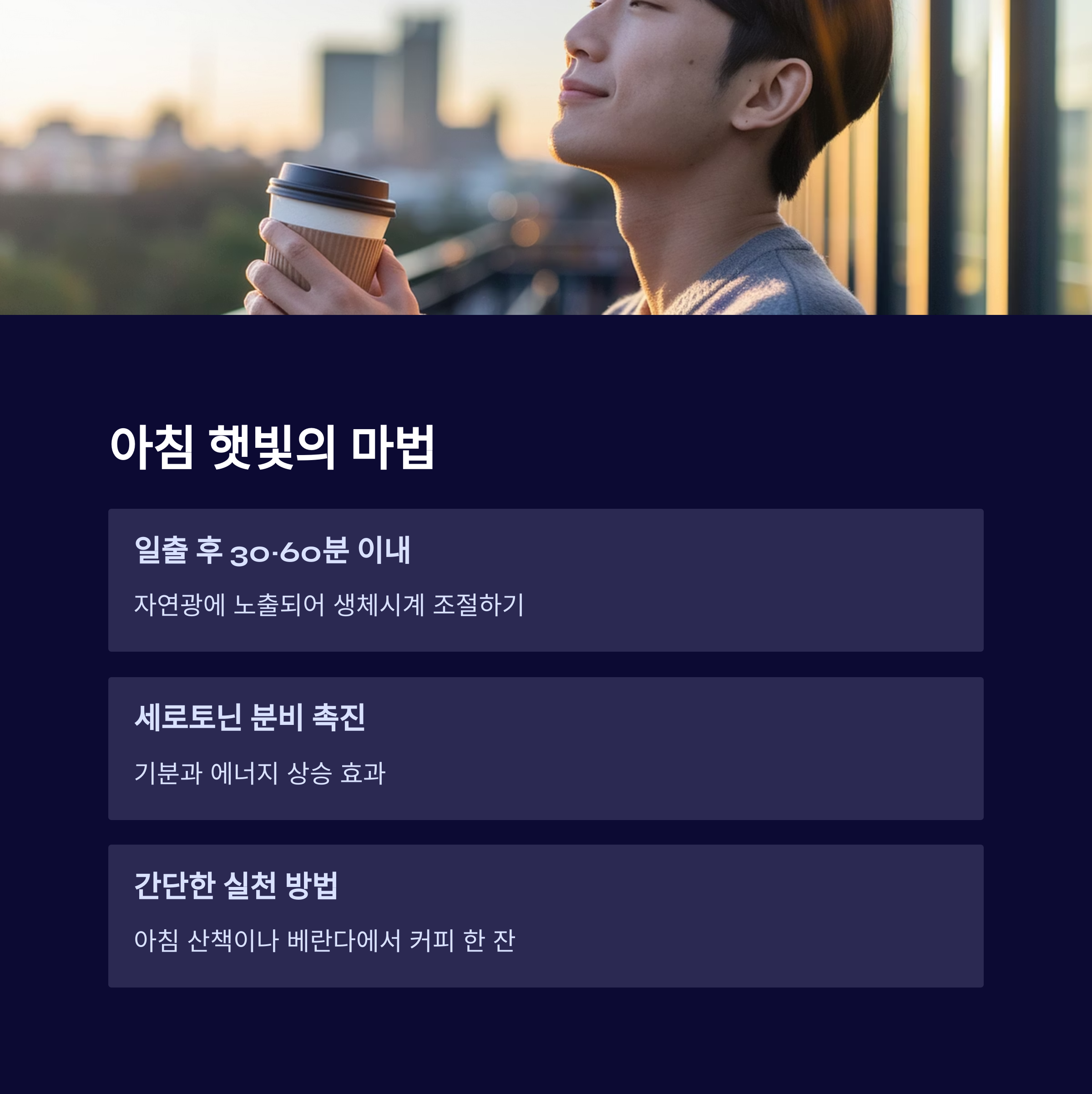 | 기상 후 햇빛 쬐기 | 하루 계획 세우기 | 카페인 섭취는 오후 2시 전까지만 |