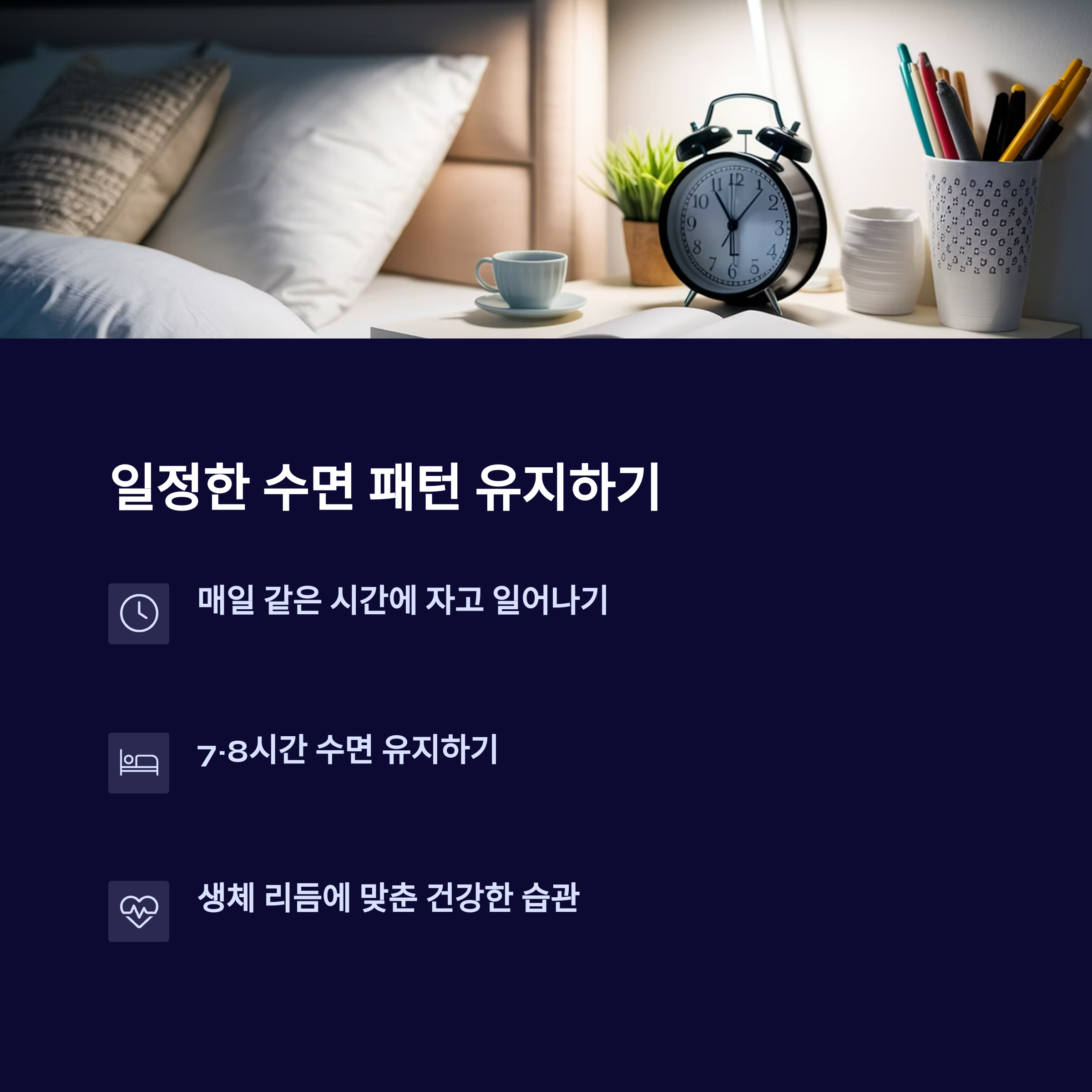 | 일정한 시간에 자고 일어나기 | 명상, 운동, 독서 등 의미 있는 활동 | 어두운 조명, 스마트폰 멀리하기 |