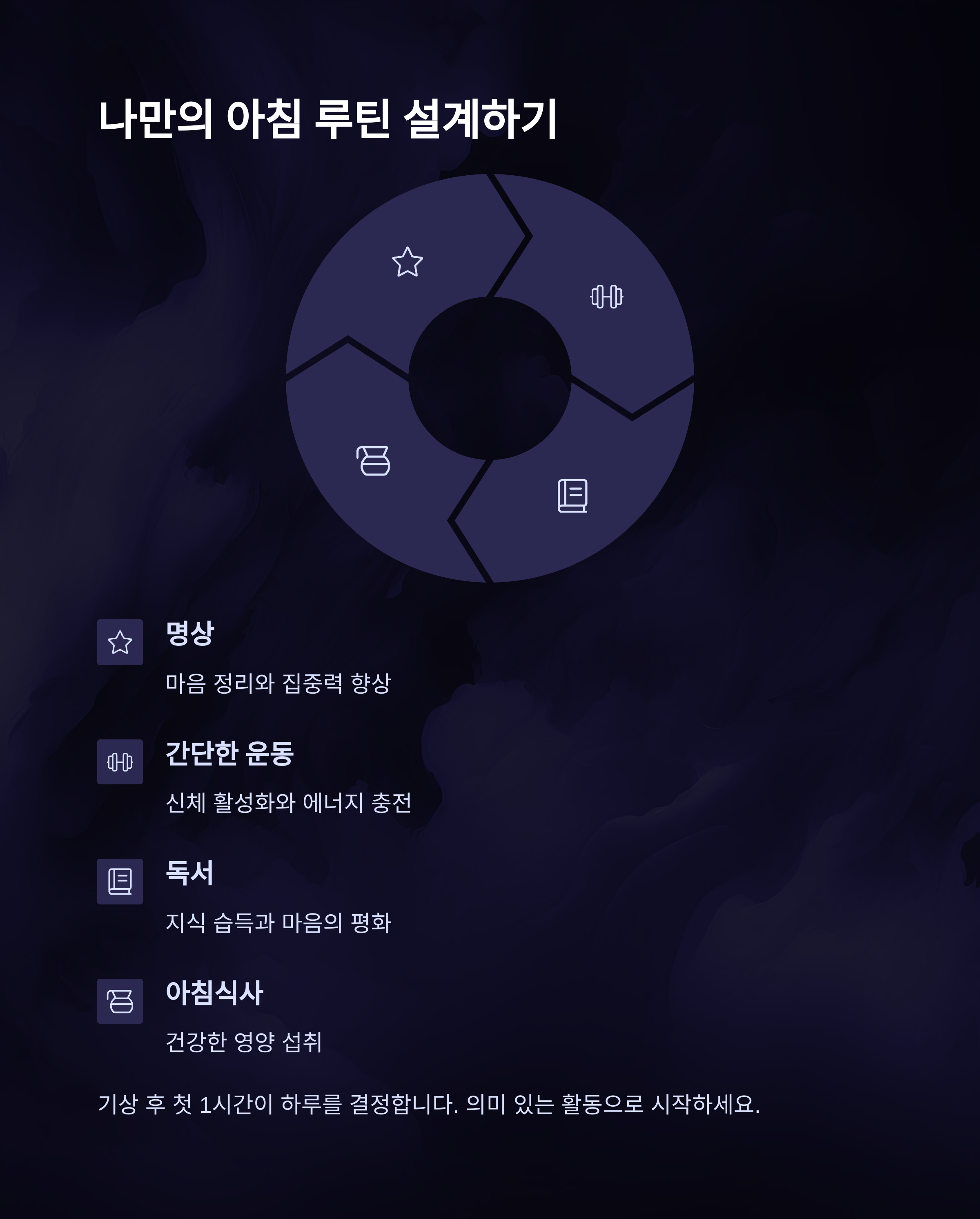 | 아침 루틴 효과 | 집중력 향상, 정신적 안정, 자기계발 시간 확보에 효과적입니다. |