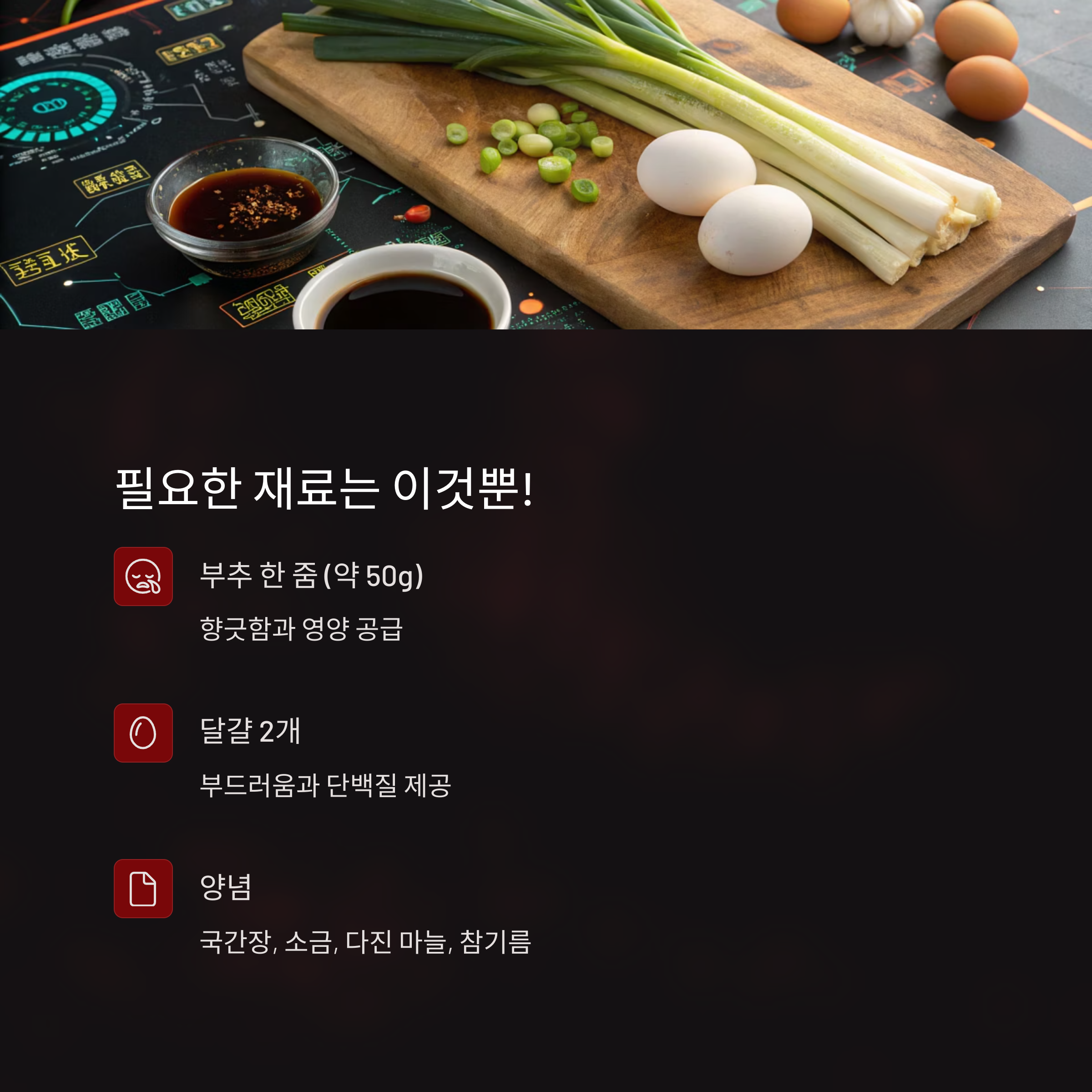 | 부추 | 한 줌 (약 50g) | 향긋함, 영양 공급 |