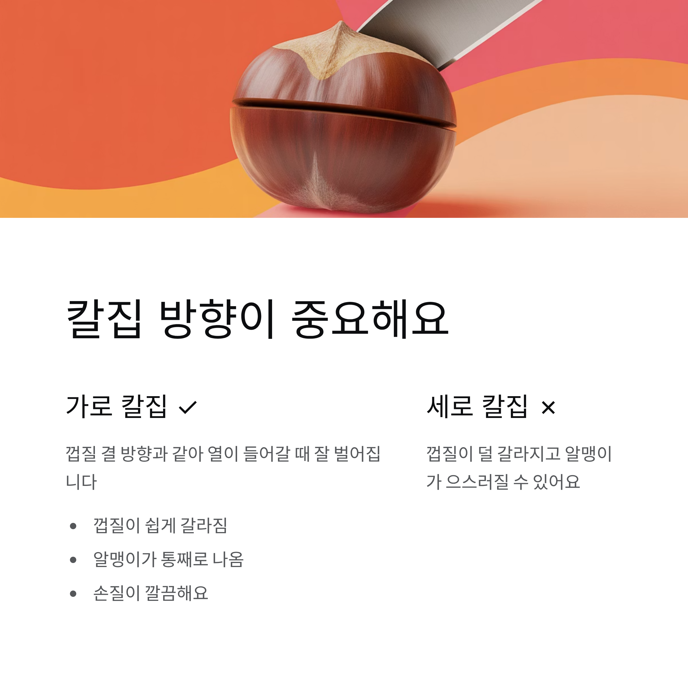 밤껍질은 결이 가로 방향으로 퍼져 있어요. 그래서 가로로 칼집을 내면 열이 들어갈 때 껍질이 잘 벌어집니다. 반면 세로로 칼집을 내면 껍질이 덜 갈라지고, 오히려 알맹이가 으스러지기도 해요. 껍질을 쉽게 벗기려면 가로 방향 칼집이 핵심이에요.