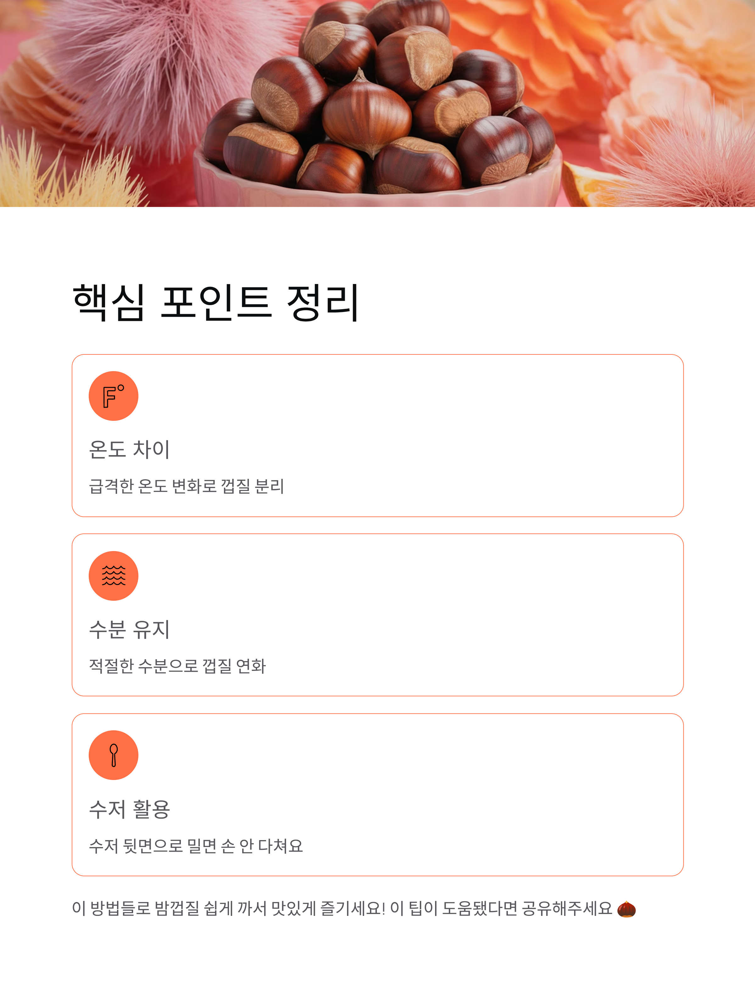결국 밤을 쉽게 까는 비법의 핵심은 ‘온도 차이’와 ‘수분 유지’예요. 이 두 가지만 기억하면 알맹이가 저절로 빠져나오는 신기한 순간을 경험하실 거예요. 손 아프게 밤 까느라 고생하지 마시고, 오늘 알려드린 방법으로 편하게 즐겨보세요.