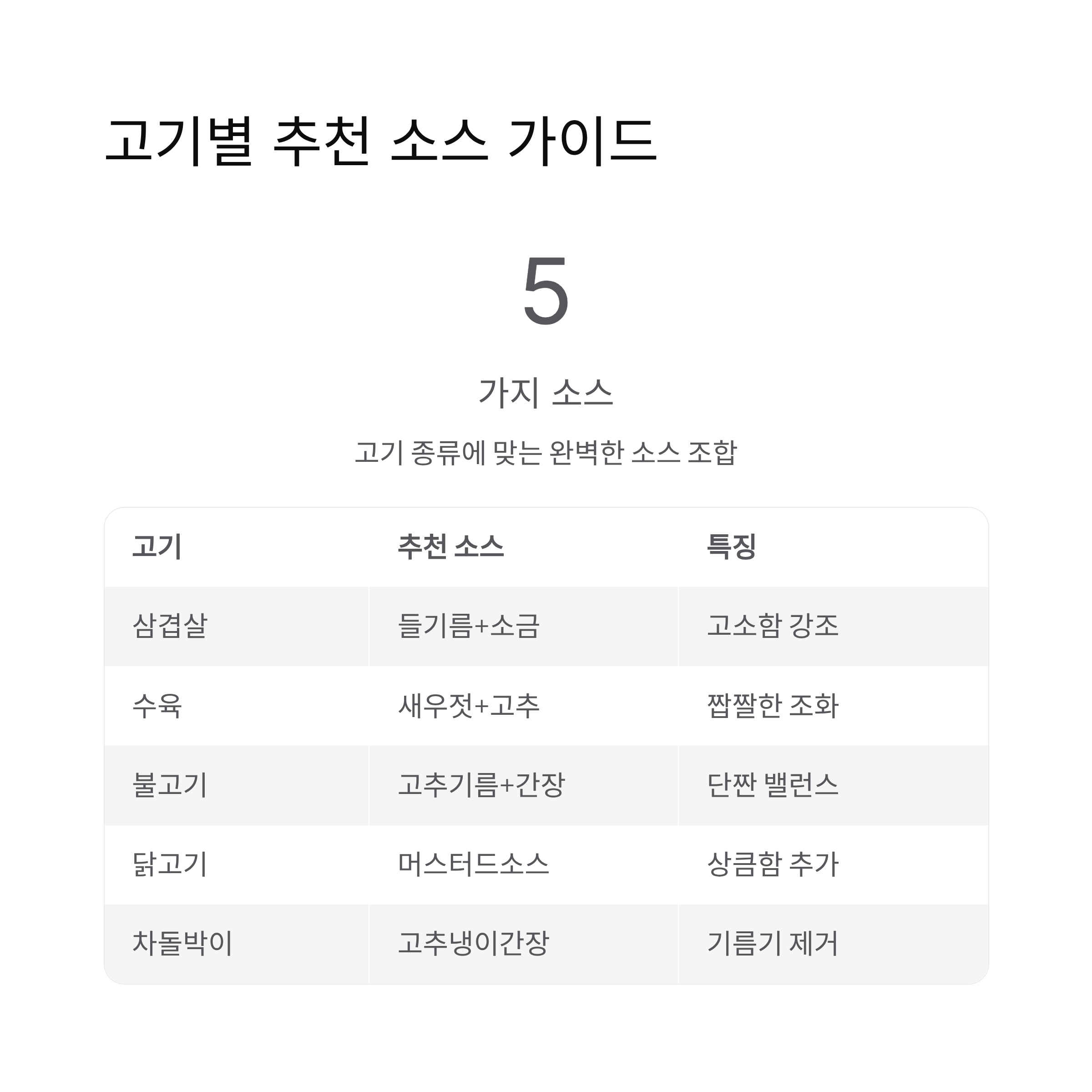 고기 종류에 따라 소스를 바꾸면 맛이 훨씬 풍성해져요.