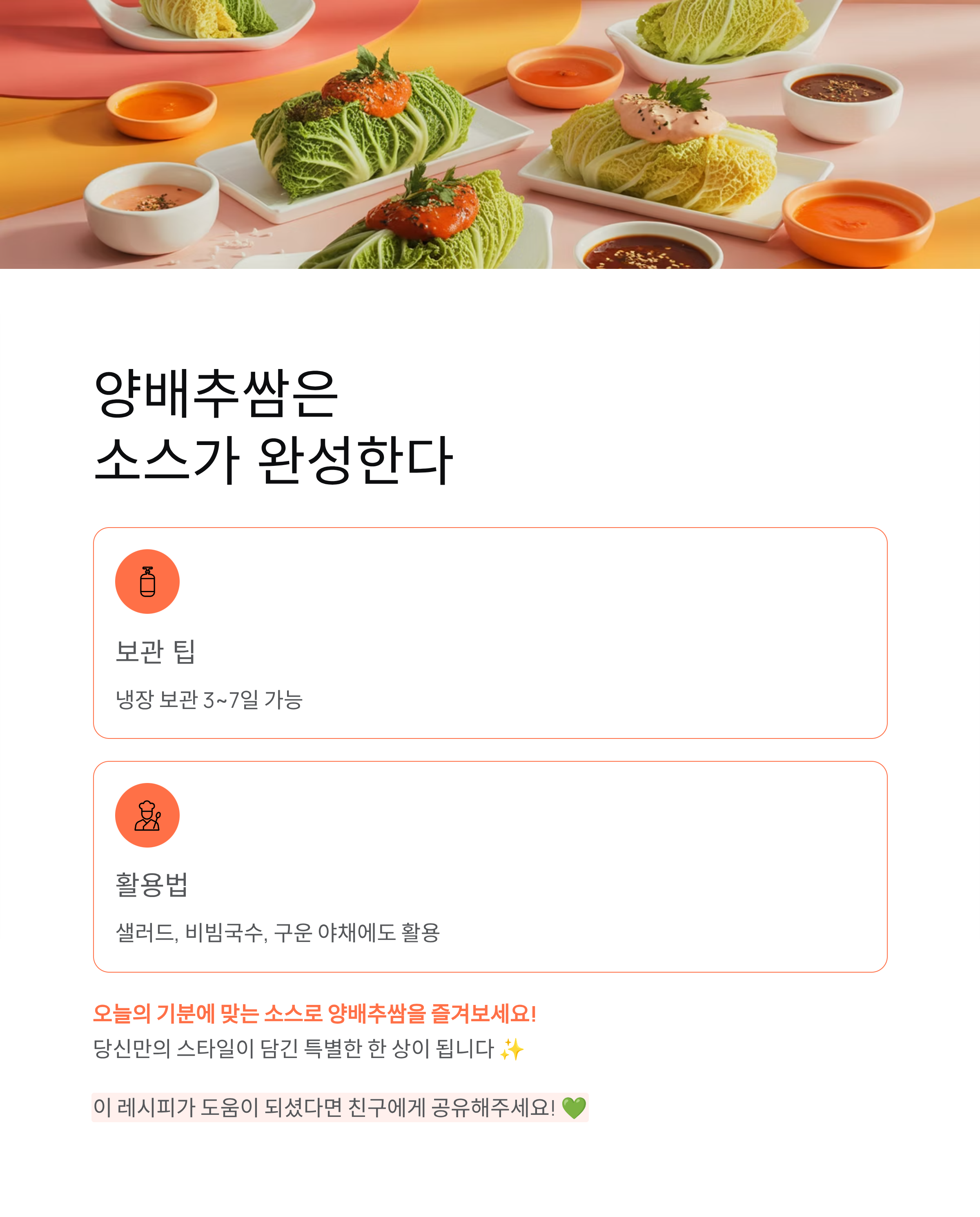 특히 양배추쌈은 담백하고 달큰한 맛이 매력이라, 어떤 소스를 곁들이느냐에 따라 완전히 다른 요리가 됩니다.