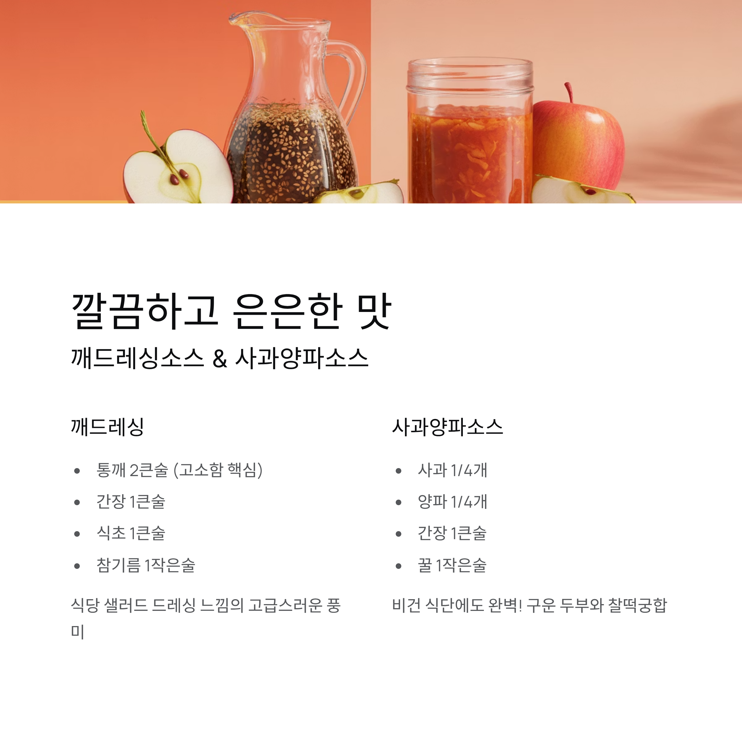 | 사과양파소스 | 상큼하고 자연스러운 단맛 | 구운 두부, 곡물쌈 |