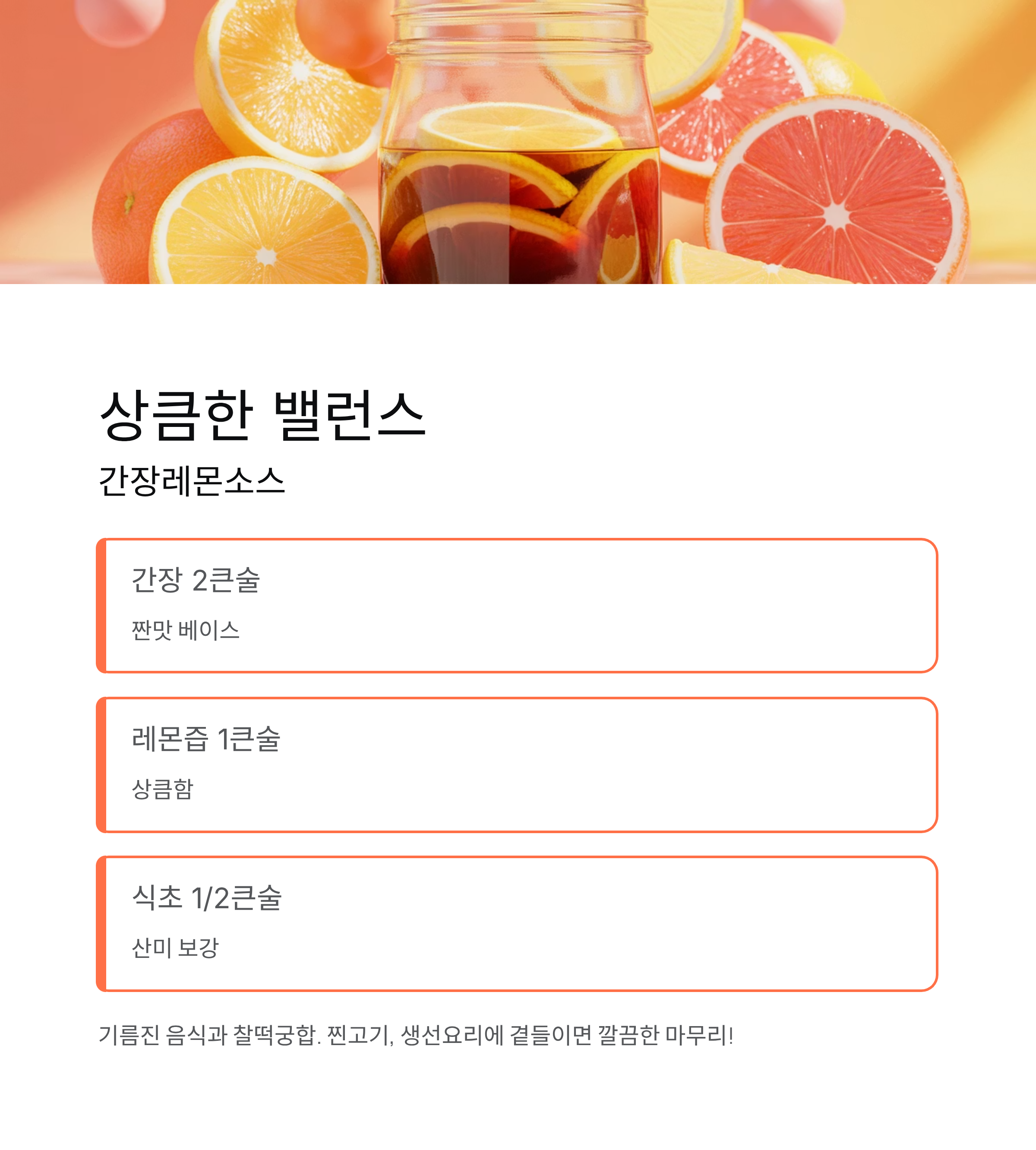 | 간장레몬소스 | 상큼하고 깔끔함 | 찐 양배추, 생선요리 |