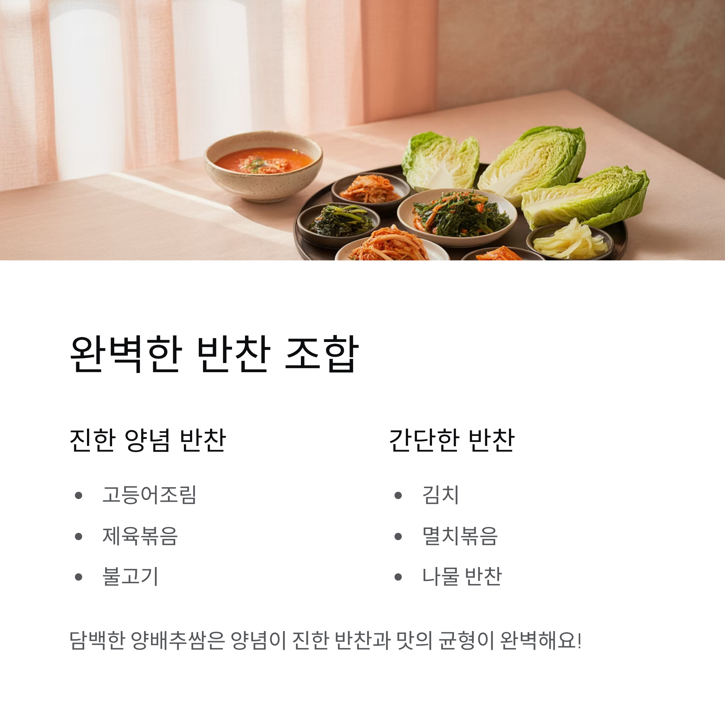 양배추쌈은 담백한 맛이 강하므로 양념이 진한 반찬과 잘 어울립니다.
