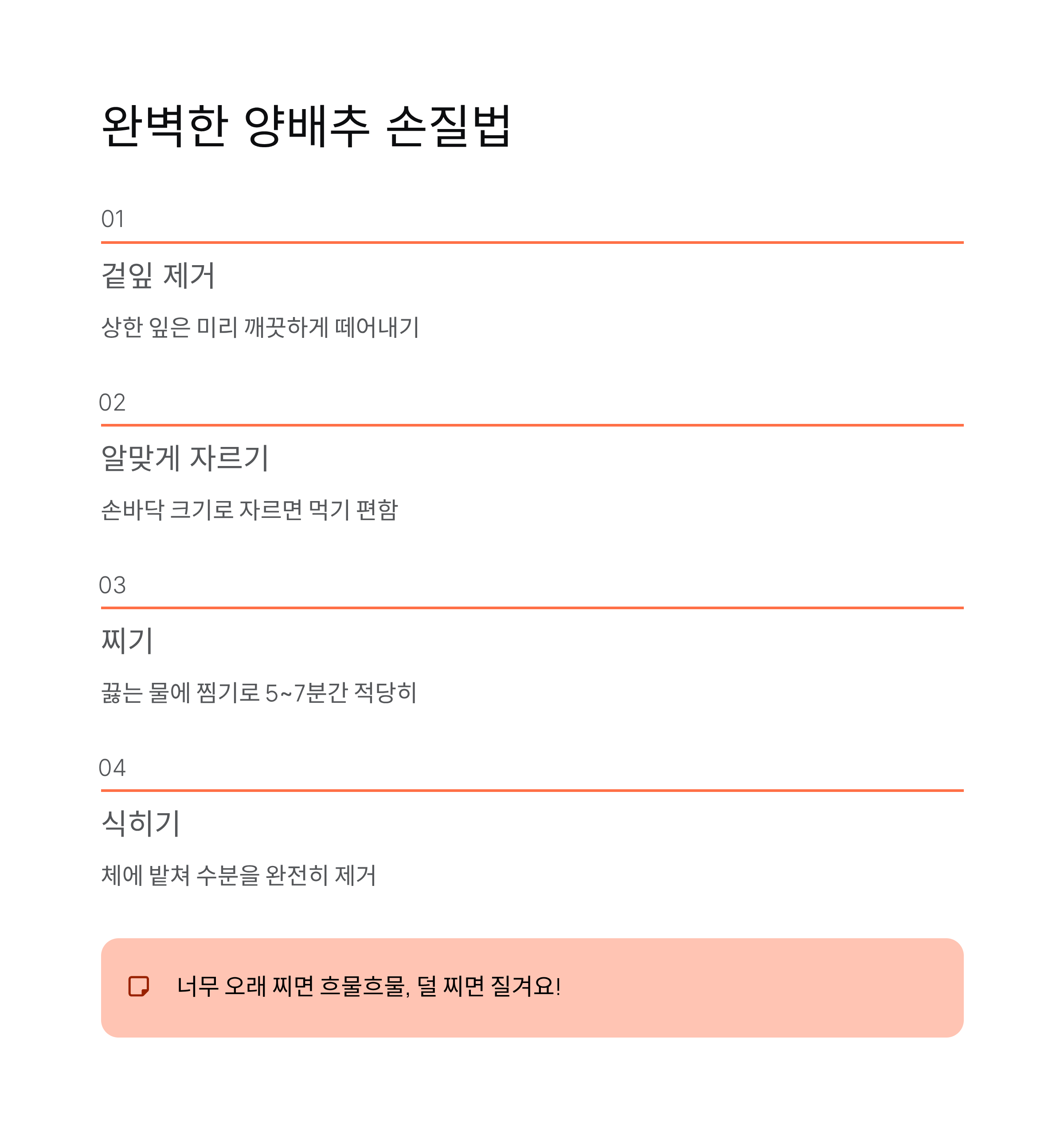 | 1 | 겉잎 제거 | 상한 잎은 미리 떼어냄 |