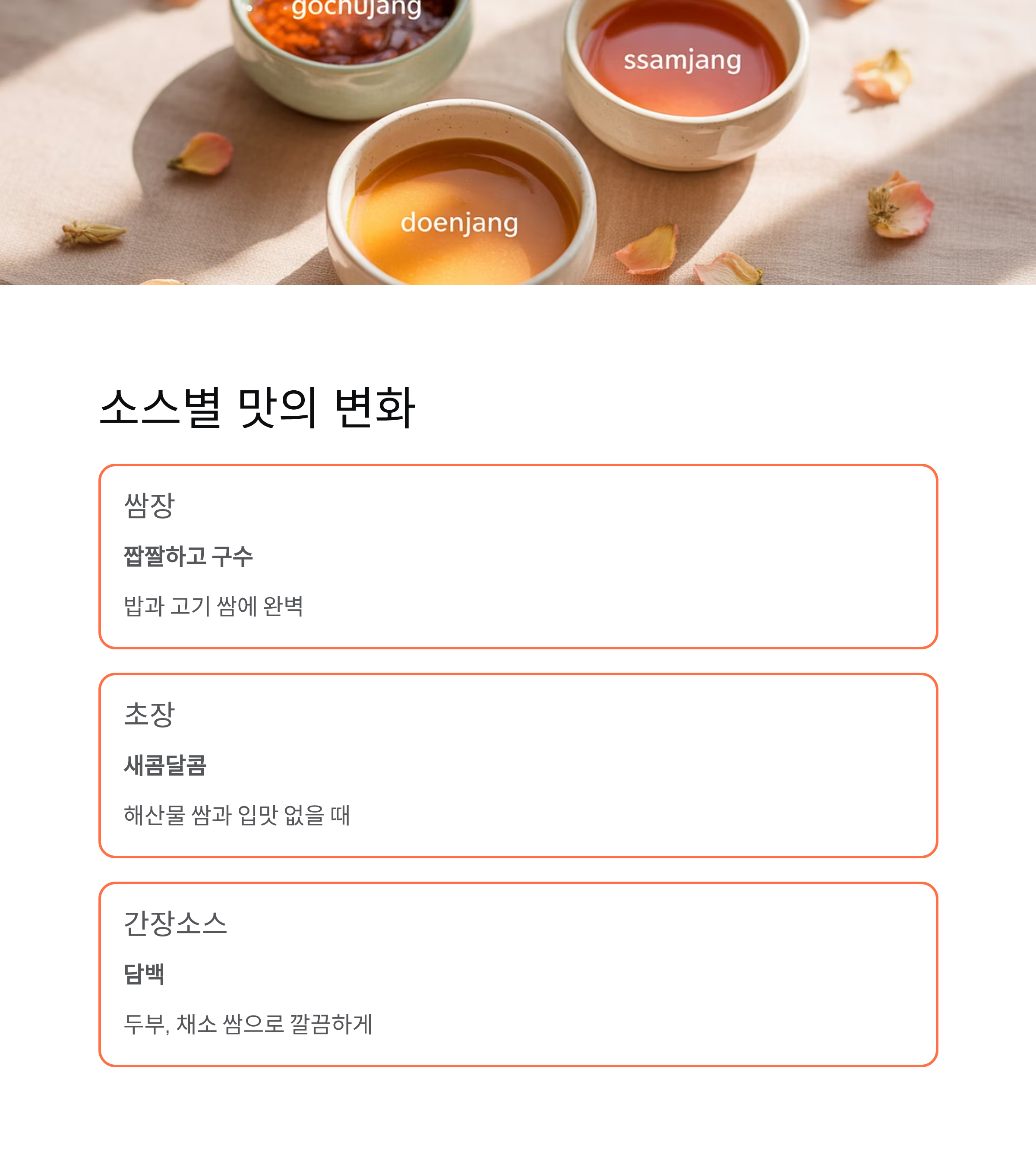 | 간장소스 | 담백 | 두부, 채소 쌈 |