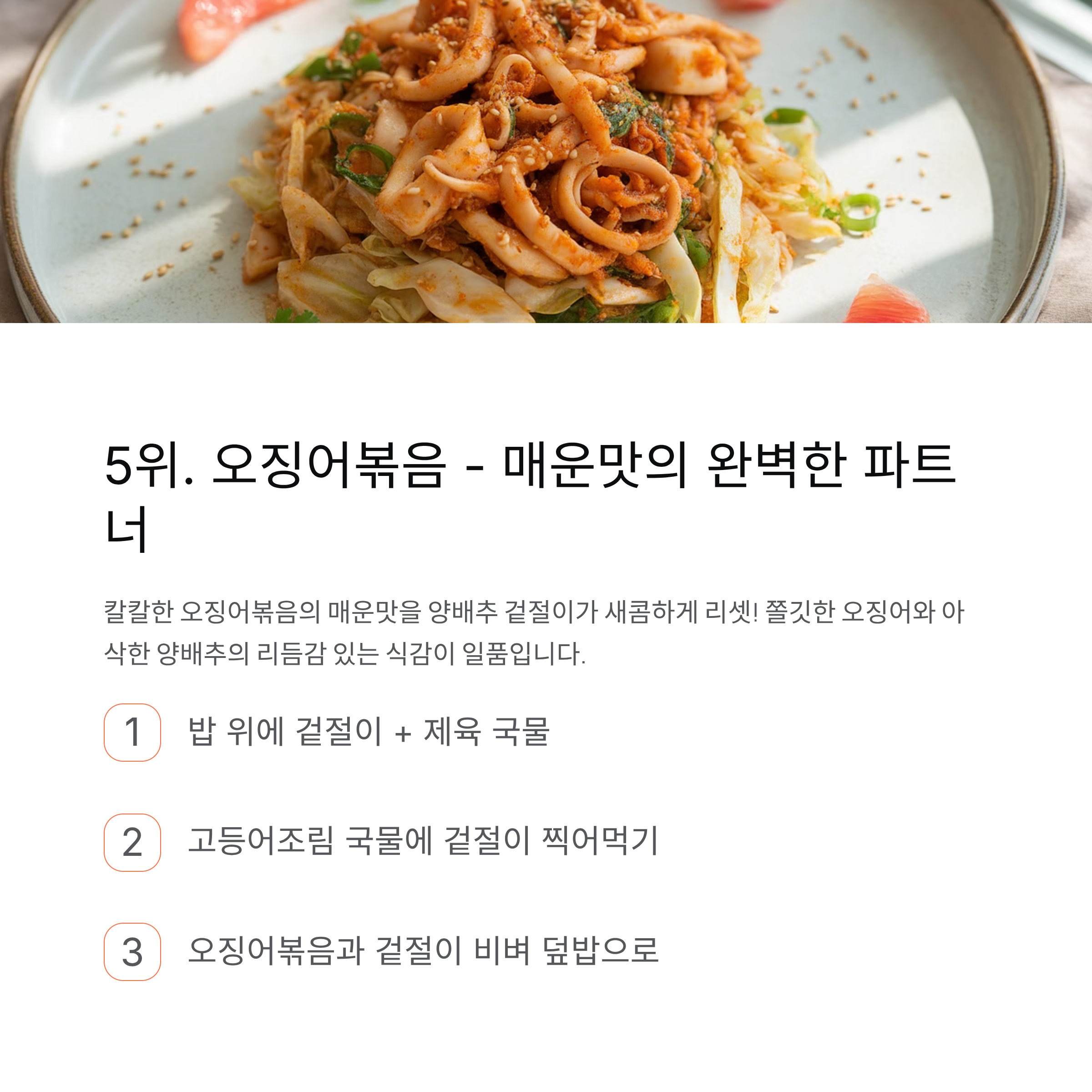 칼칼하고 매운 오징어볶음은 양배추 겉절이와 만나야 진짜 완성됩니다.