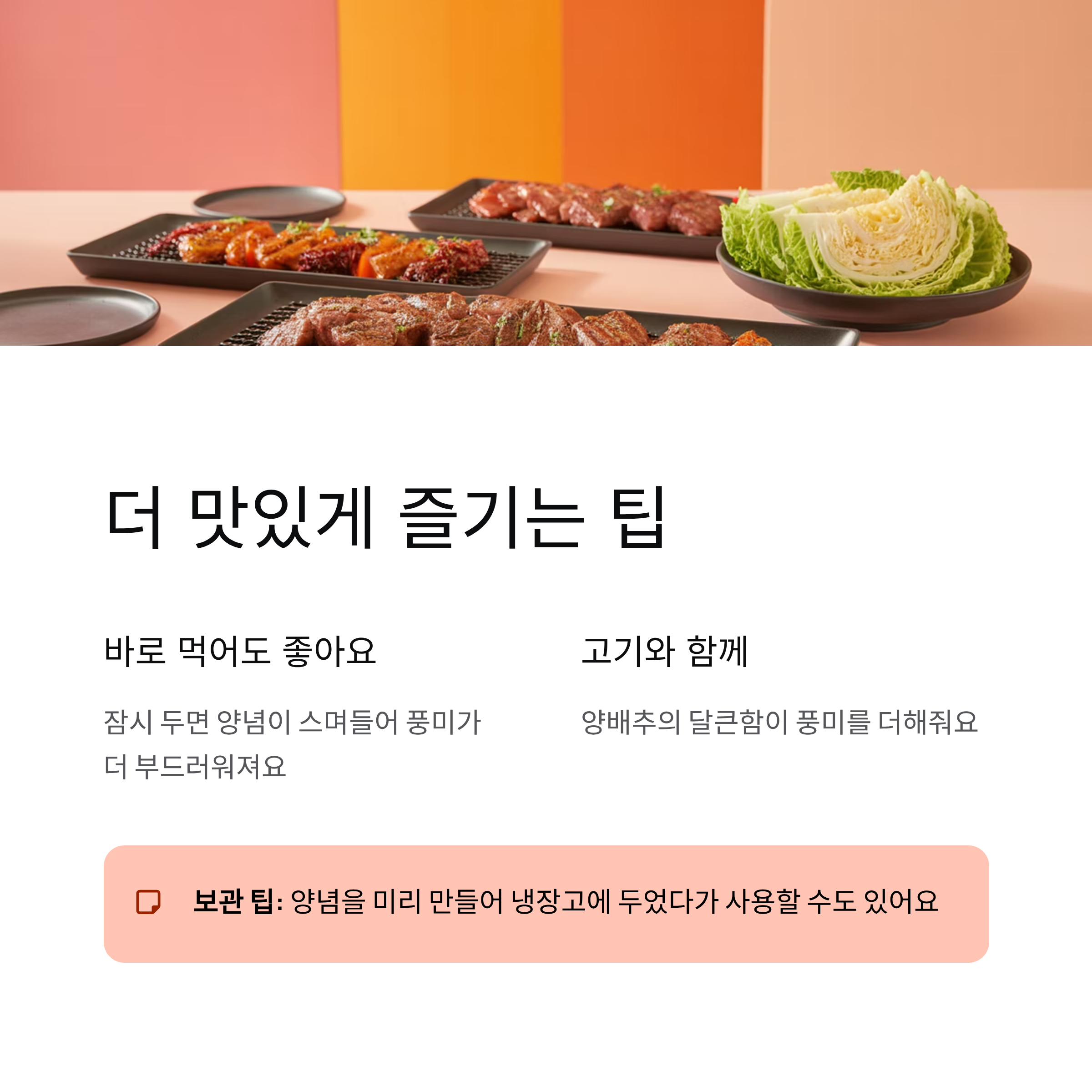 겉절이는 바로 먹어도 좋지만 잠시 두면 양념이 양배추 사이로 스며들어 풍미가 더 부드럽게 살아나요. 밥반찬으로도 좋고 고기와 함께 먹으면 양배추 본연의 달큰함이 풍미를 더해줘서 만족도가 높아요. 양념을 미리 만들어 냉장고에 두었다가 사용할 수도 있어요.
