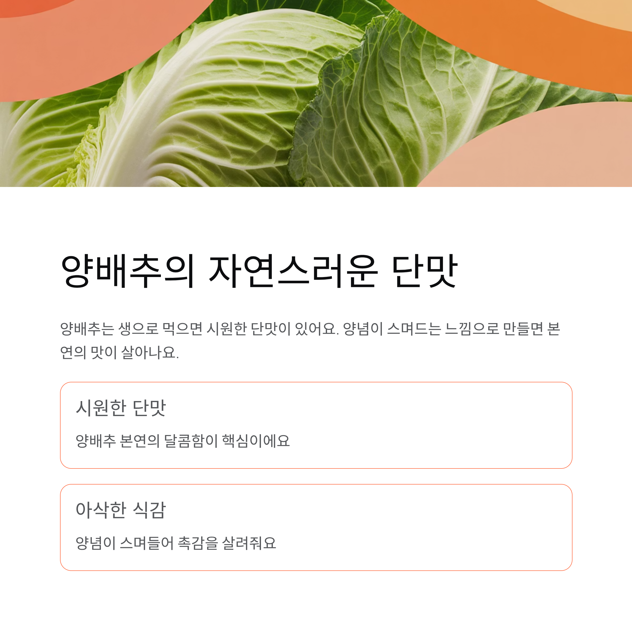 양배추는 생으로 먹으면 시원한 단맛이 있고, 양념이 닿으면 재료의 촉감을 그대로 살려주는 식감이 있어요. 그래서 겉절이에서는 양배추 본연의 단맛이 살아나도록 짠맛과 매운맛을 과하게 넣지 않는 것이 중요해요. 양념이 양배추를 덮는 방식보다는 스며드는 느낌을 만들어주는 것이 좋아요.
