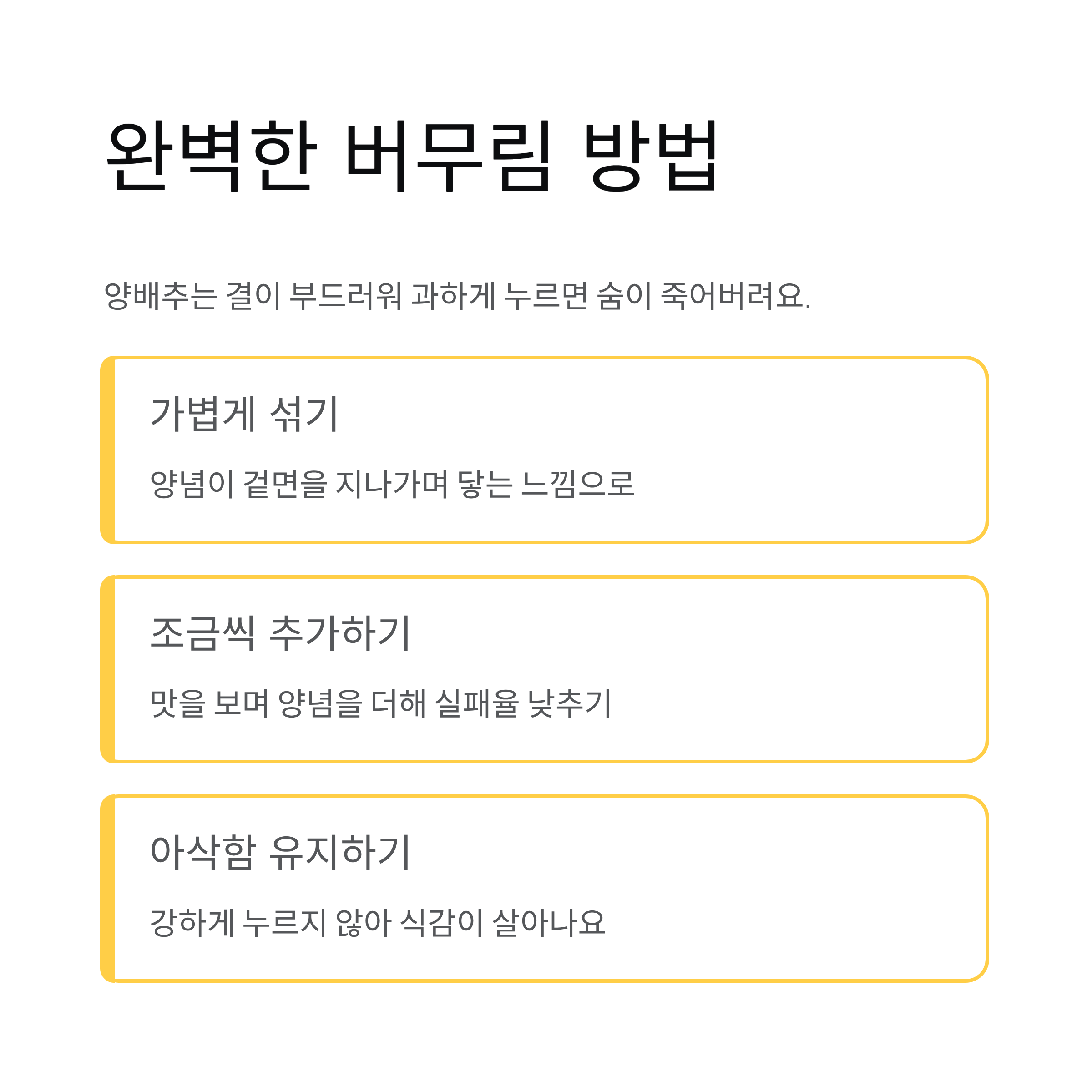 버무릴 때는 너무 강하게 섞지 않는 것이 좋아요. 양배추는 결이 부드러워 과하게 누르면 숨이 죽어버려요. 양념이 겉면을 지나가며 닿는 느낌으로 가볍게 섞으면 아삭하고 향이 살아 있는 겉절이를 만들 수 있어요. 양념을 조금씩 추가해 맛을 맞추면 실패 확률이 훨씬 낮아요.
