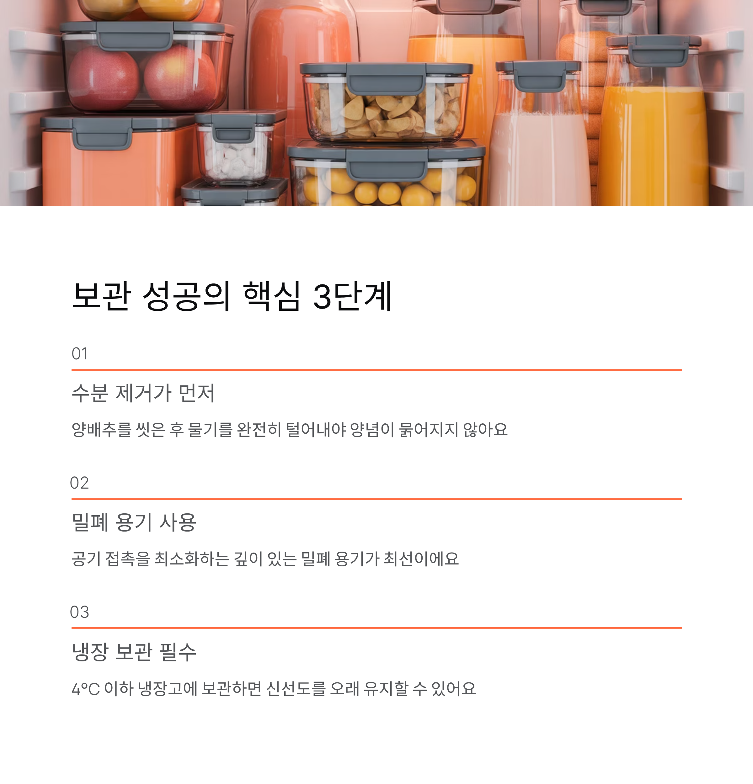 양배추는 수분이 많은 채소라 양념과 함께 두면 금세 숨이 죽고 물기가 생겨요. 겉절이는 생채 형태라 시간이 지나면 아삭함이 사라질 수밖에 없는데, 이 점을 고려해 보관 환경을 조절해주면 훨씬 오래 유지할 수 있어요. 신선도는 양배추 특성에 크게 영향을 받아요.